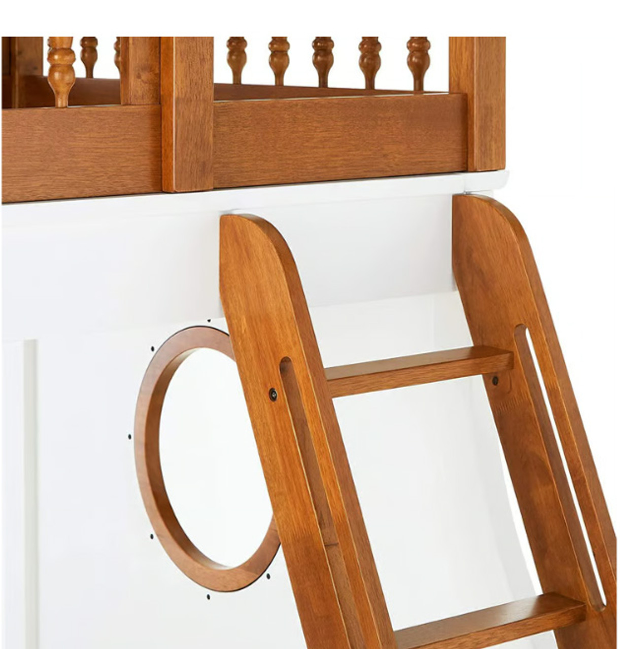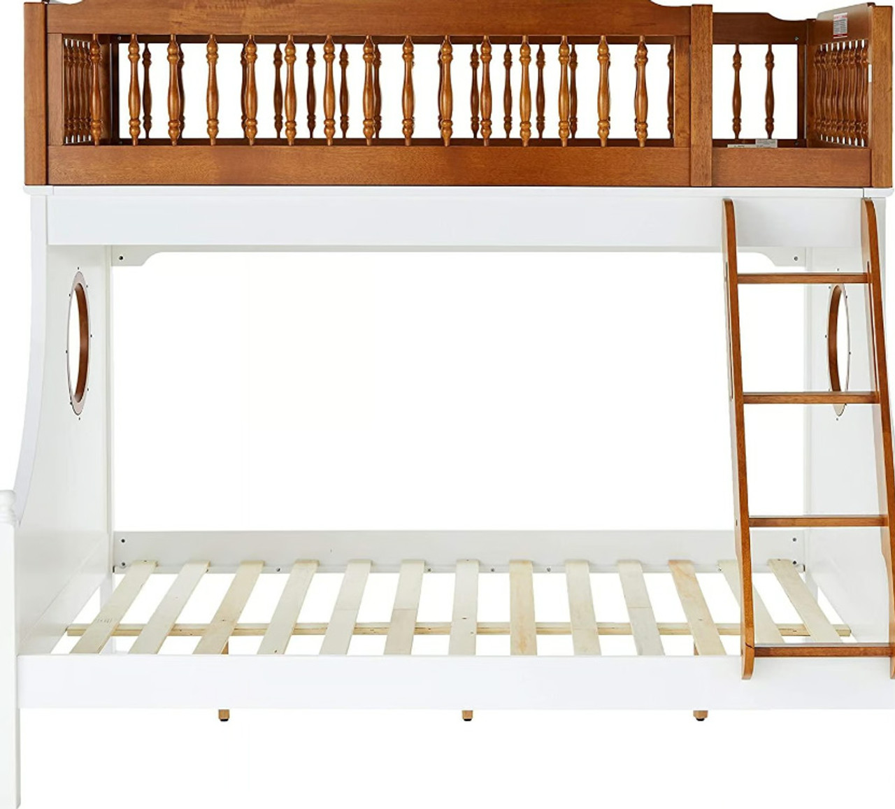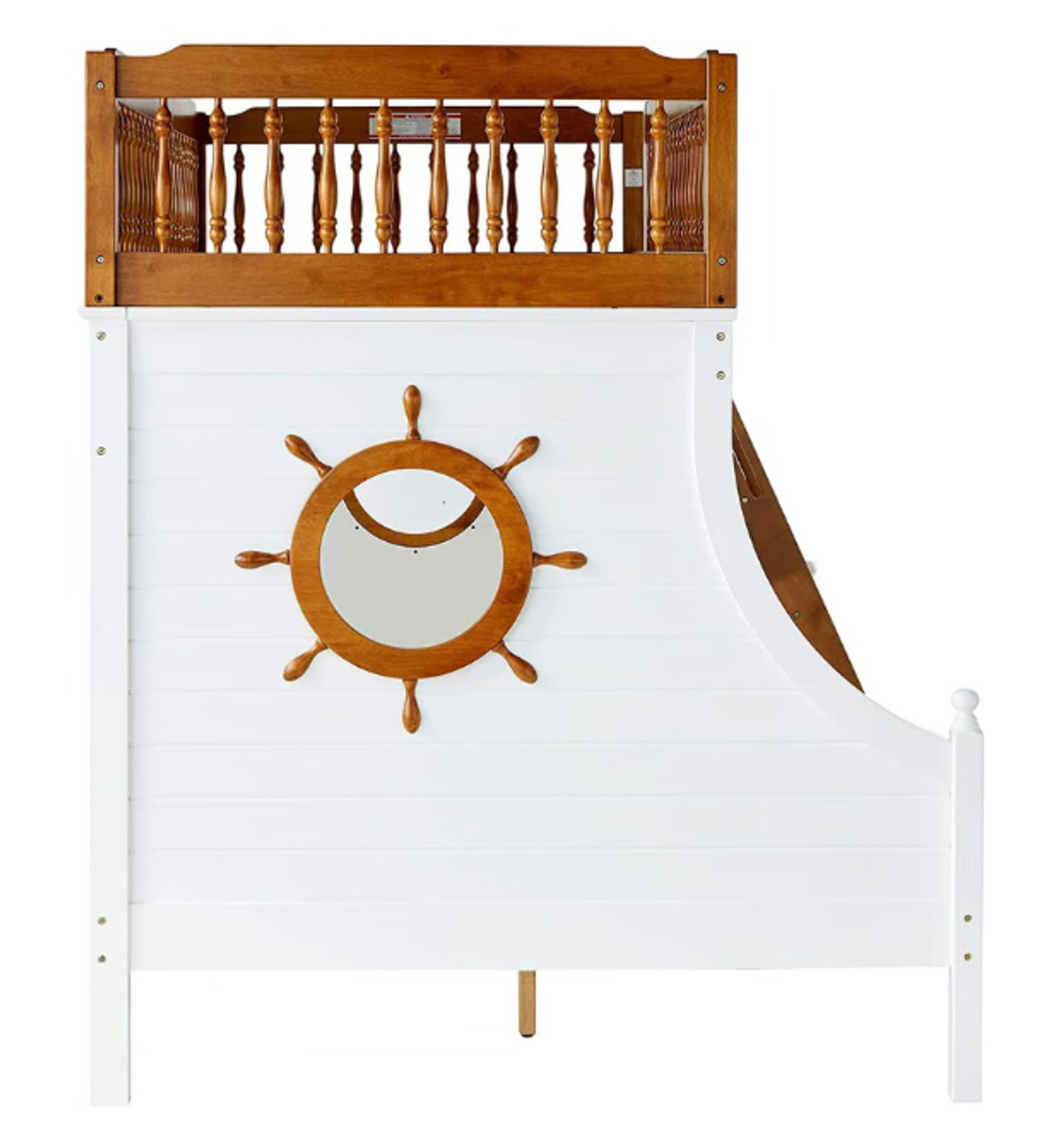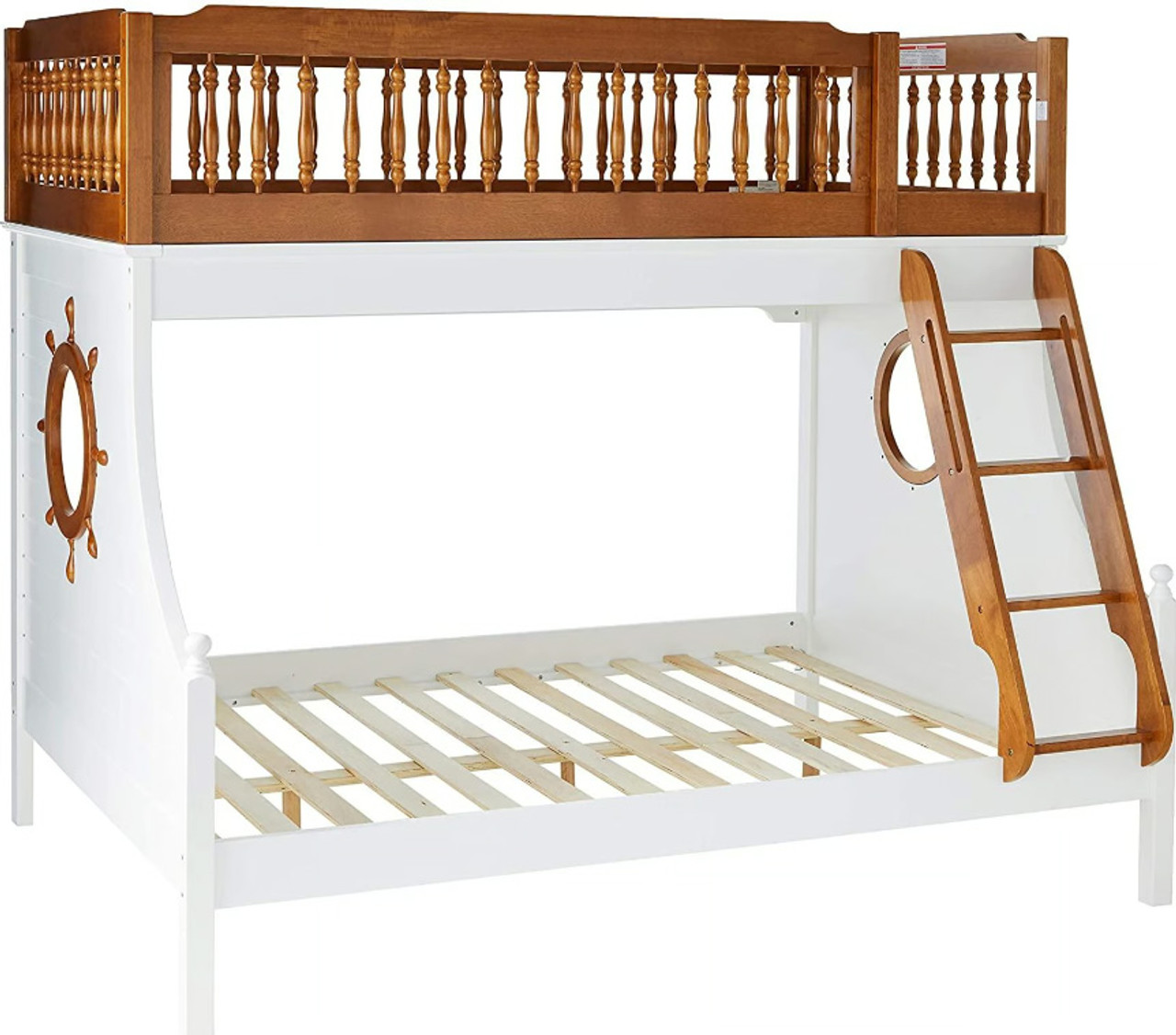 Bring joy to your little sailor's face with the Nautical collection. The bunk bed features twin over full beds in a warm oak and white finish, easy access guardrail with decorative turned spindles, right facing built-in ladder, supporting slat system and decorative finials . Any children will love the ship wheel design on both walls, make bedtime feel like playtime.