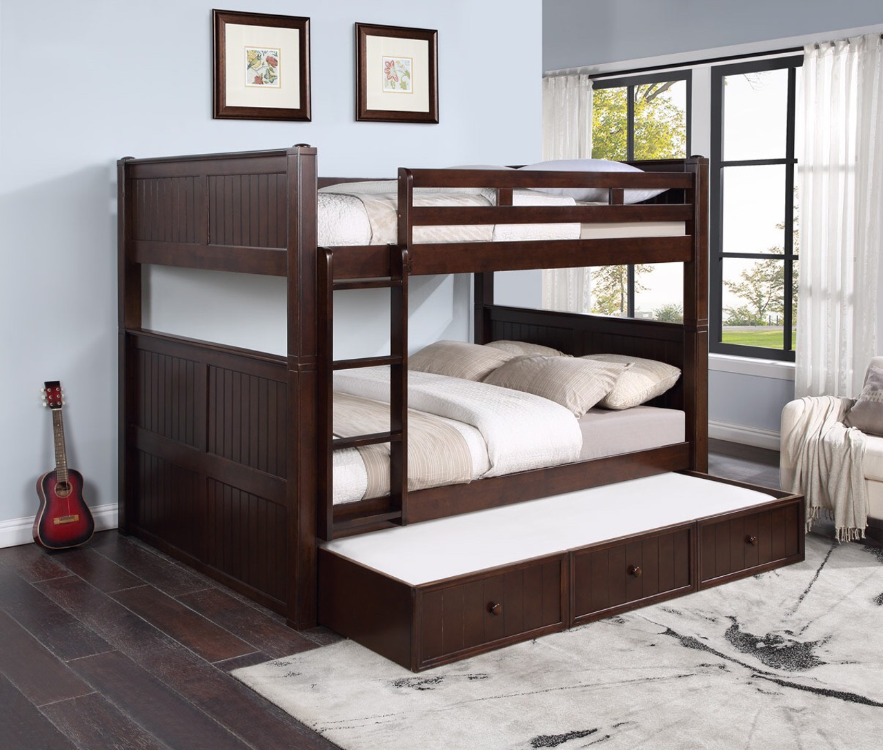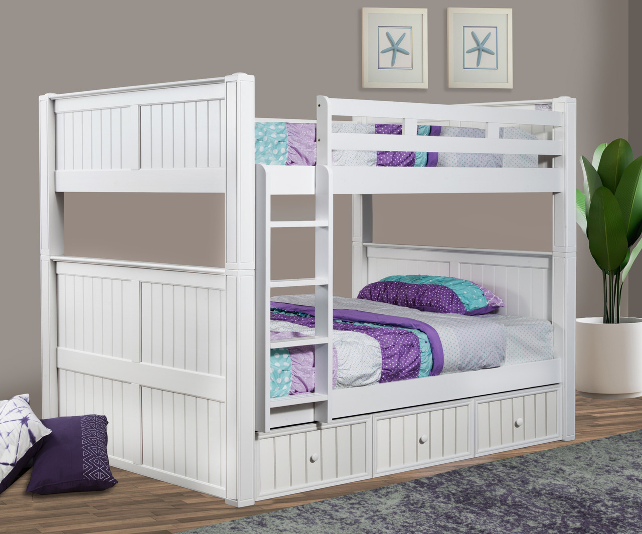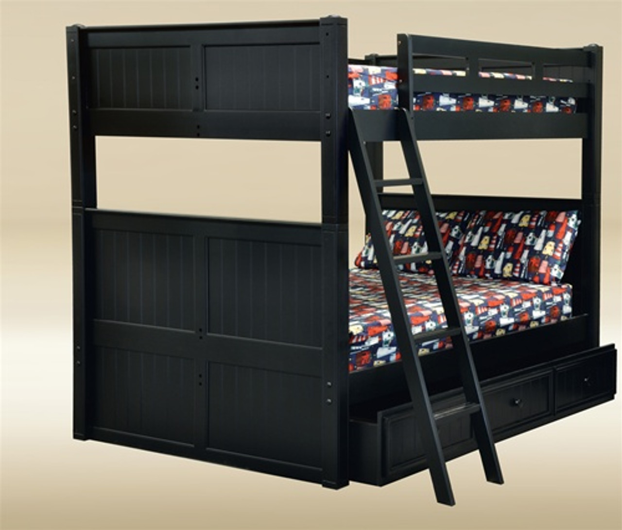 Introducing the beautifully constructed Dillon full over full bunk bed. Featuring top quality Eco-friendly solid hardwood construction, bead board paneling that provides privacy as well as style. Additional features include safety rails for upper unit, angled or vertical ladder, metal to metal connection for structural strength, and under bed slat support system. The bunk can be converted into two separate full-size beds. The space saving bunk frame appeals to youth, teens, and college students. Want to increase functionality? Add under-bed drawers for storage. Don't like the color? Additional color options include: Black, gray, white, espresso and navy blue. Customize your room even further by adding any of these set pieces: 6-drawer chest, 2-drawer night stand, 5-drawer chest, under bed trundle, and 3-drawers chest.