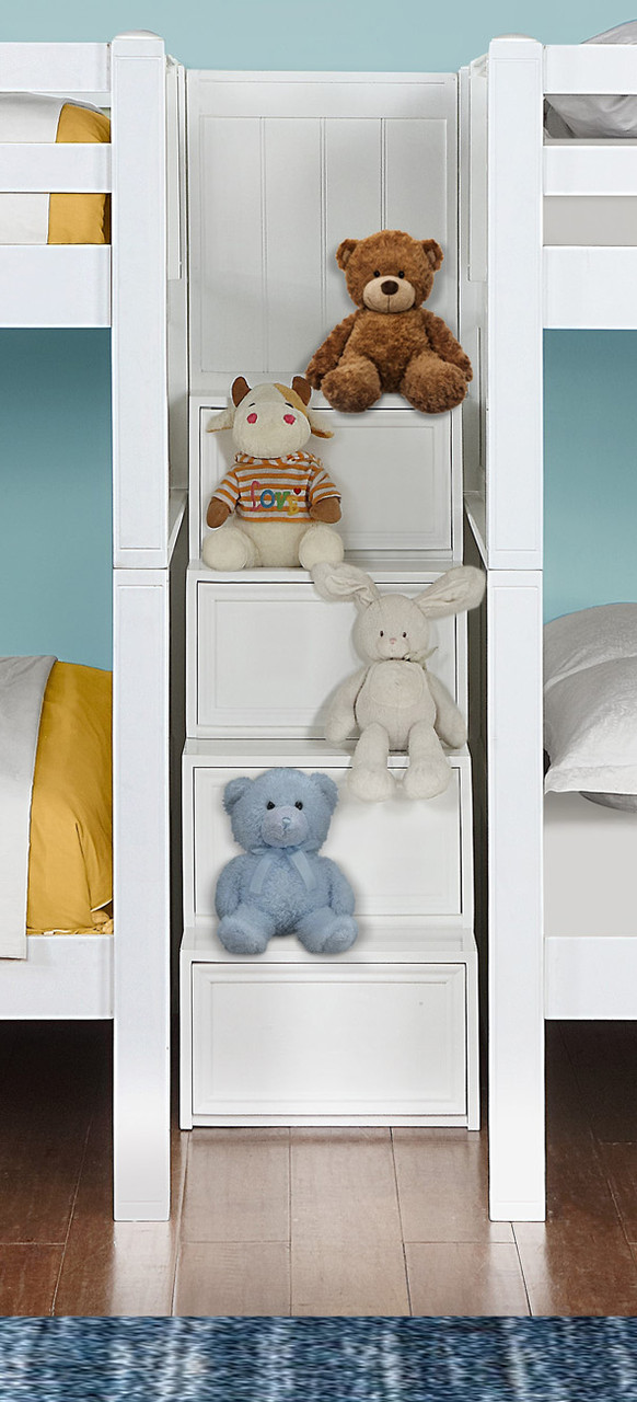 The Dillon Quadruple Full size bunk bed with stairs in the middle is the perfect solution for shared space. This bed is beautifully crafted from quality Eco-friendly solid hardwood to ensure sturdiness and durability. The two Full size bunks make this bed perfect for vacation homes or cabins. The headboard and foot board feature privacy bead board paneling with square posts. The storage stairs in the middle provide easy access for both upper bunks. Additional features include safety rails, stairs with spacious drawers, metal to metal connection for structural strength, and under bed slat support system. The bed can be converted into two separate beds when needed. Want to increase functionality? Add under bed drawers for extra storage. Color options include: white, black, Gray, and navy blue. Customize your room even further by adding any of these set pieces: 6-drawer chest, 2-drawer night stand, 5-drawer chest, and 3-drawers chest.