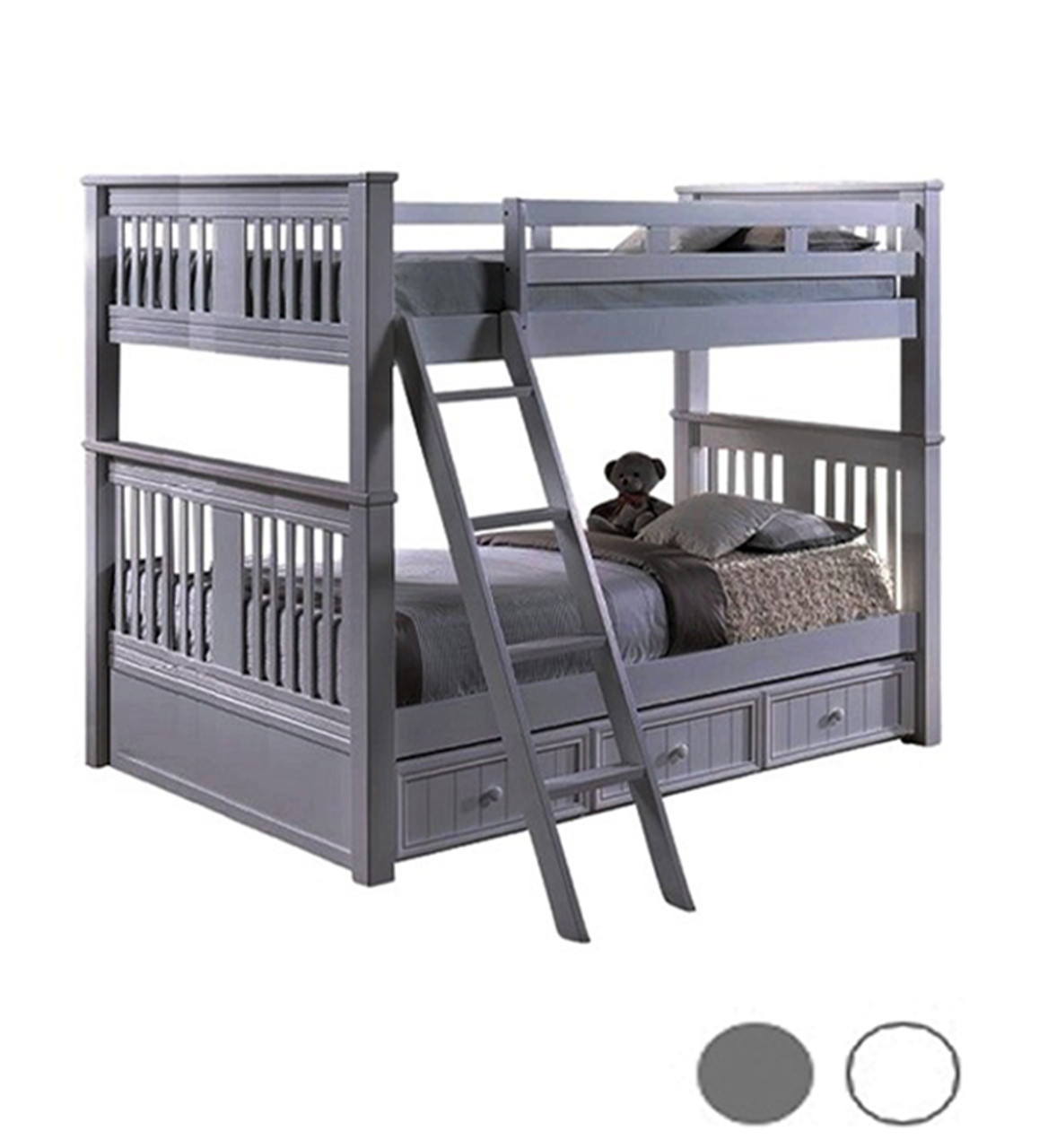 The Gary Mission Queen size bunk bed is a space-saving solution for any compact space. This bunk is ideal for siblings, teens & college students! Constructed from Eco-friendly solid hardwood and comes in white, gray and espresso finish. This sturdy bunk is designed to be durable yet functional. It converts into two separate Queen-size beds with ease! Other features include mission style headboards, stylish full length safety rails, hidden hardware for clean look. No box spring is required, as slat support system is provided, making it mattress-ready. The reversible ladder is available in both vertical and slanted versions. To make a better use of the space below the bunk? Add under bed drawers or XL twin or XL Full trundle bed to your order. The Gary Queen over Queen bunk bed will make your Cabin or vacation home more unique and stylish. Optimize your floor space by adding a 5-drawer chest. If you don't like the slanted ladder, you can select the vertical ladder version.