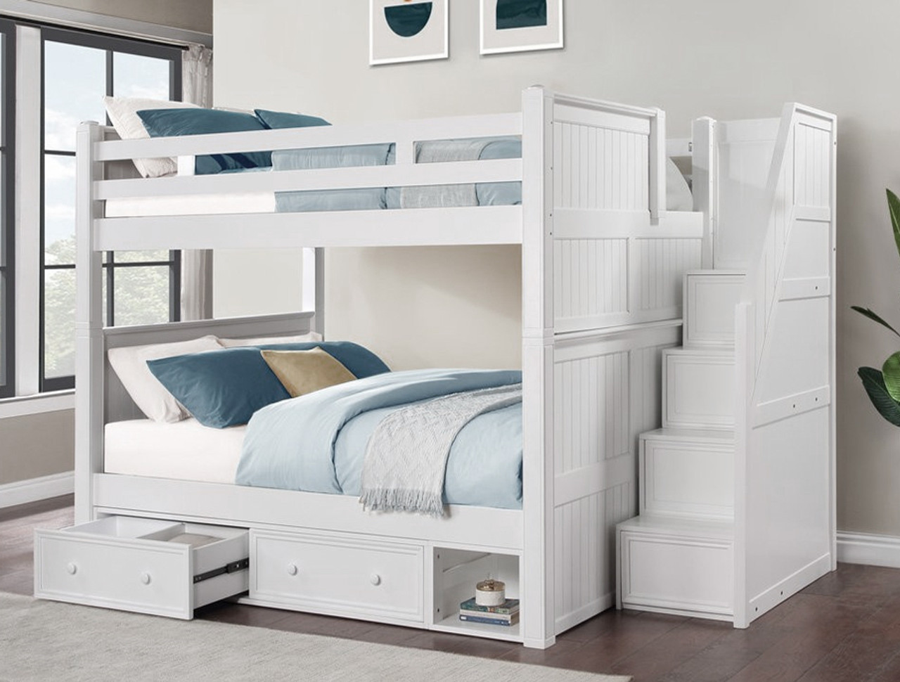 - Space saving Queen bunk bed with stairs is available with both trundle and storage drawers