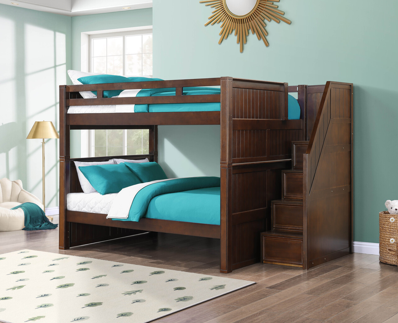 The Dillon Queen Size bunk bed with storage stairs is the perfect solution for shared space. This bed is beautifully crafted from quality Eco-friendly solid hardwood to ensure sturdiness and durability. This Dual Height Queen bunk bed with stairs is perfect for youths and adults in homes, cabins & vacation homes. This updated version features a dual height setting bottom rail, the first setting is 4 inches off the floor, creating a head clearance of 43", or a second height 12 inches off the floor creating a clearance of 35". The headboard and foot board feature privacy bead board paneling with square posts. The bed can be converted into two separate beds when needed. Want to increase functionality? Add under bed drawers for extra storage. For extra sleeping space add a twin XL or full XL trundle bed. Color options include: white, black, gray, espresso and navy blue. Customize your room even further by adding any of these set pieces: 6-drawer chest, 2-drawer night stand, 5-drawer chest, and 3-drawers chest.