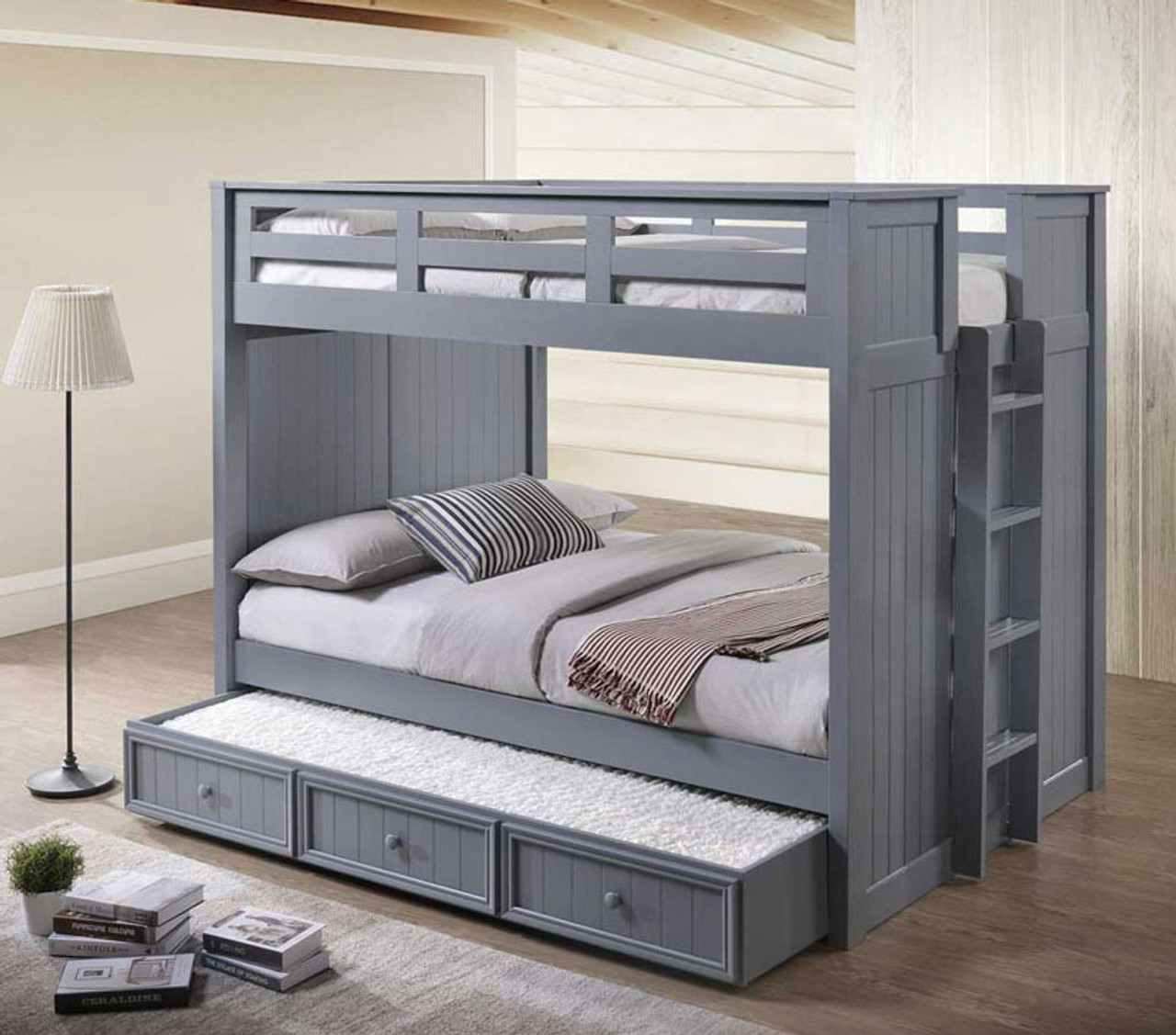 Provide stylish sleeping space with the Austin Bead Board XL Twin over XL Twin Bunk Bed. This bunk features Eco-friendly sold hardwood construction, decorative bead board paneling and clean lines that look great in any décor. This bunk is fully customizable featuring adjustable bottom rails that can add more height to fit a trundle for sleepovers or a set of two storage drawers for extra pillows, blankets and clothes.