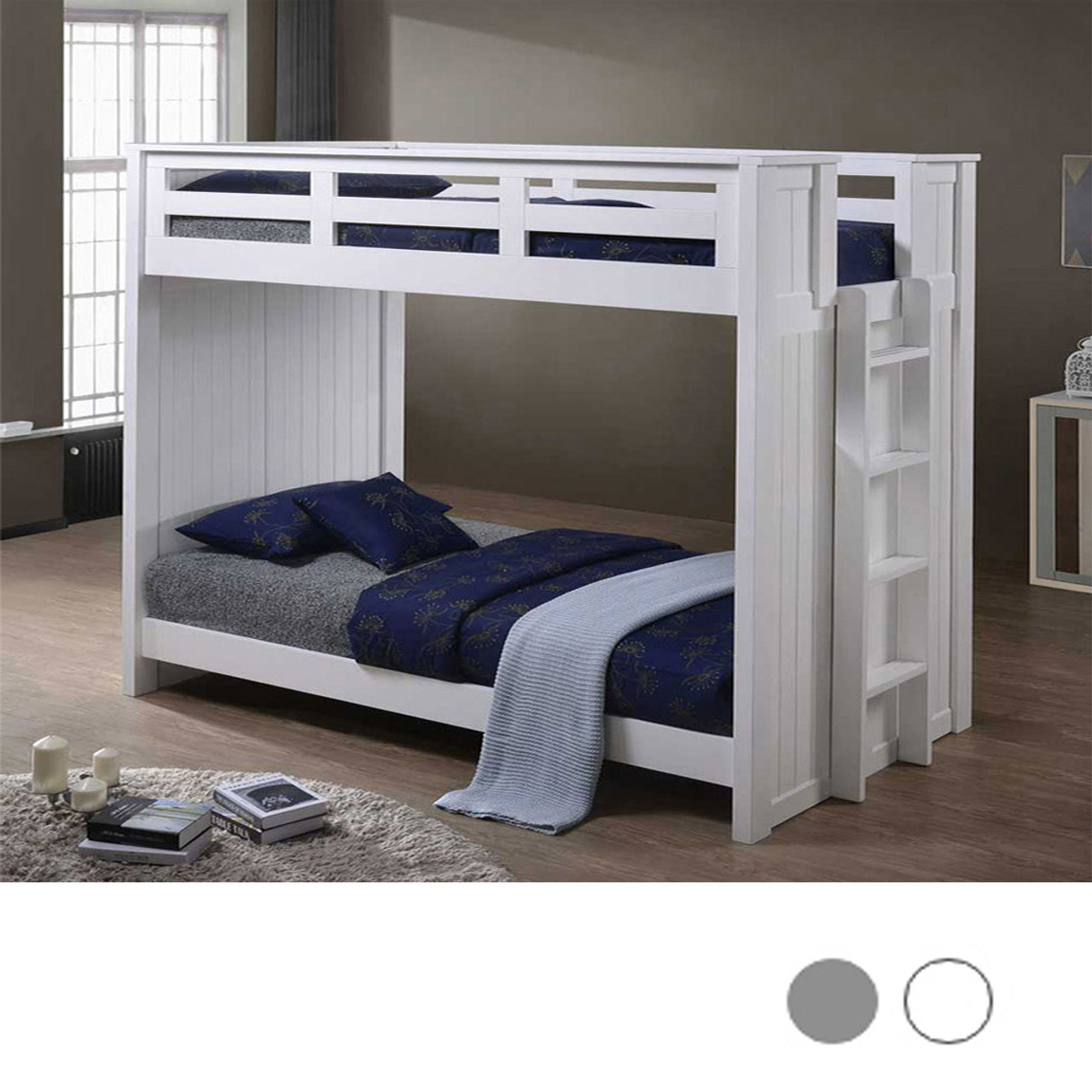 - Vertical ladder mounted to headboard. Ladder can be placed on right or left of bunk bed