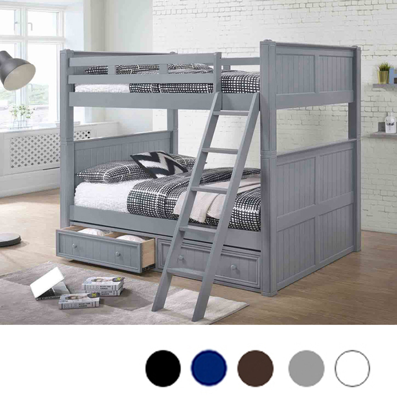 Introducing the beautifully constructed Dillon Full XL over Full XL bunk bed in a classic Coastal style. This space saving Full XL bunk bed is beautifully crafted from quality Eco-friendly solid hardwoods to ensure strength, sturdiness and durability. The headboard and foot-board feature a classic bead-board style with square posts and hidden hardware for a clean look. The sturdy bunk frame features 2 safety rails, reversible angled or vertical ladder, metal to metal connection for structural strength and an under bed slat support system. This bed is great for youth, college students & adults and is designed to convert into two separate traditional beds, when needed. It is also perfect for cabins, vacation homes, beach and lake houses, VRBOs and Airbnb's where space is limited to accommodate a large family or group. Amazing color options include white, gray, navy blue, black and espresso finish. For increased functionality, under-bed drawers can be added for additional storage Or add extra sleeping space with a pull-out trundle for an overnight guest. You can also customize your room by adding any of these set pieces; a 6-drawer dresser, a 2-drawer night stand, a 5-drawer chest to complete the look.