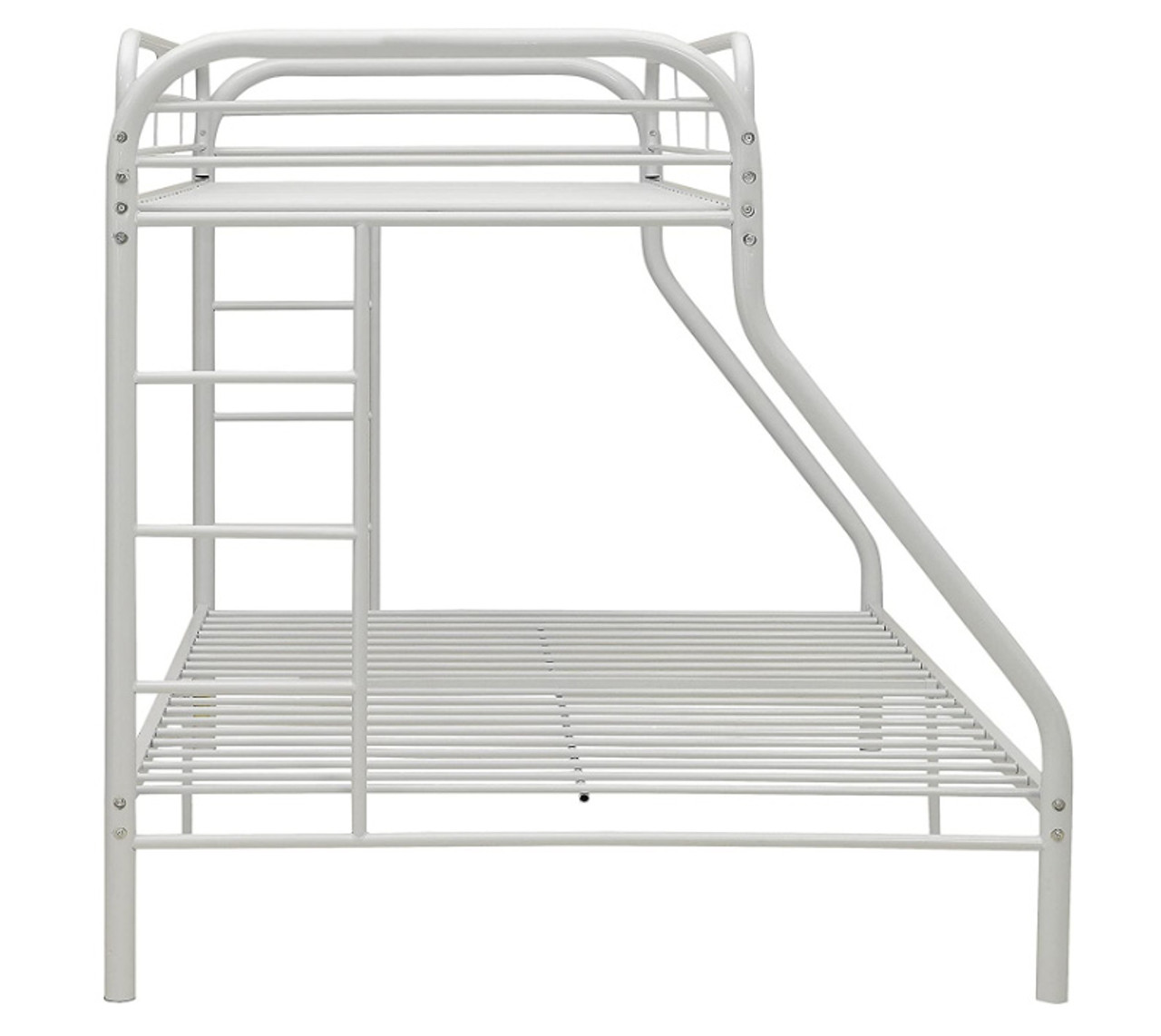 Bring home the Thornton twin XL over Queen bunk bed. Featuring tubular metal frame with built-in space saving ladders available in white, silver and black. Everyone seems to love having the queen size bed on the bottom for a rental or vacation home.