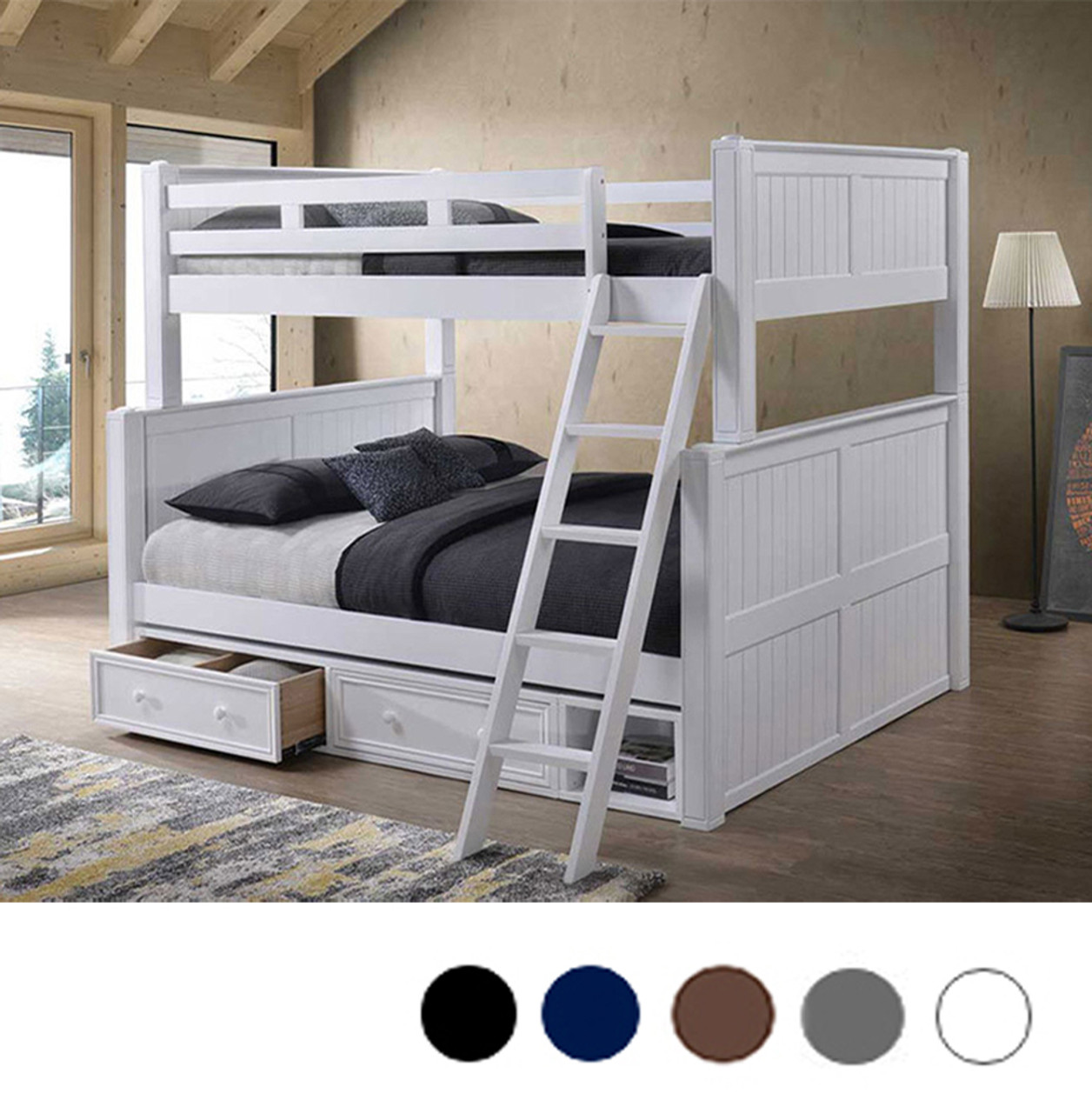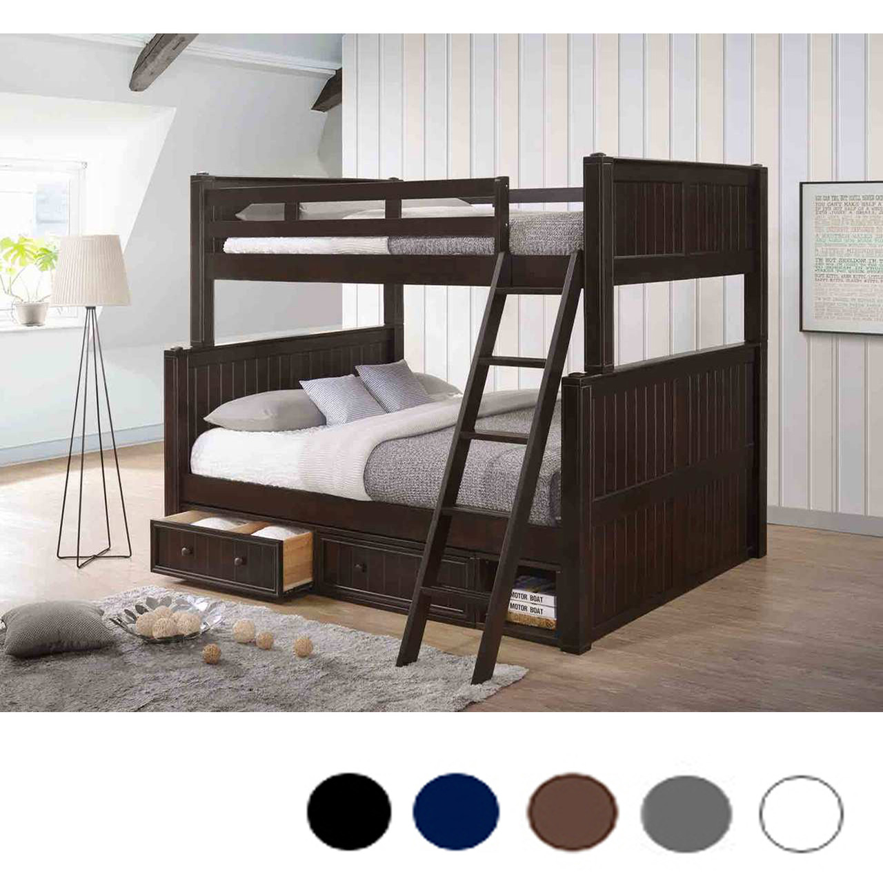 The Dillon full XL over Queen bunk bed is the perfect solution for shared space. This bunk is beautifully crafted from quality Eco-friendly solid hardwood to ensure sturdiness and durability. The full XL over Queen bunk makes it perfect for youth, college students, vacation homes or cabins. The headboards and foot boards feature privacy bead board paneling with square posts. Additional features include safety rails, hidden hardware for clean look, angled ladder, metal to metal connection for structural strength, and slat support system. The bunk can be converted into two separate beds when needed. Want to increase functionality? Add drawers for extra storage. Color options include: white, black, gray, espresso and navy blue. Customize your room even further by adding any of these set pieces: 6-drawer dresser, 2-drawer night stand, and 5-drawer chest.