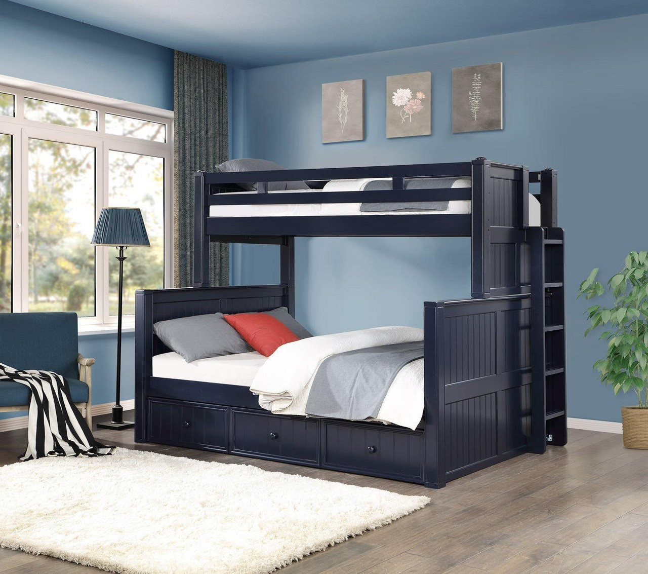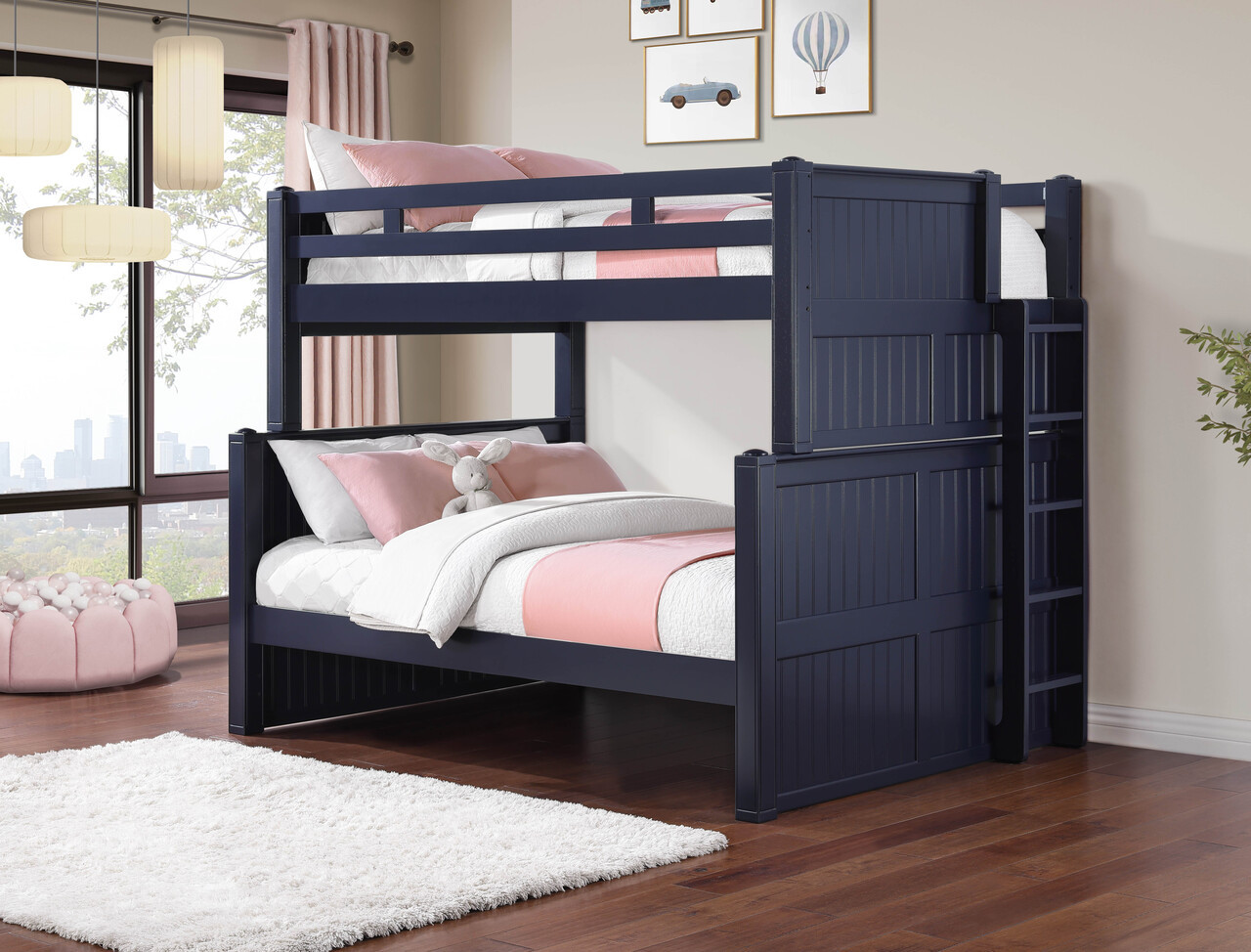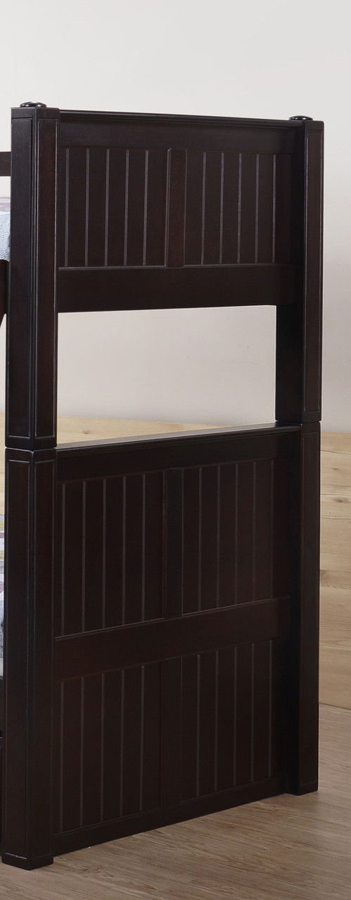 Introducing a new version of the popular Dillon full XL over Queen bunk bed. This new version includes a space saving side mounted ladder for ease of access to upper bed and a dual height settings for the lower rail, the first setting 4" off the floor creating a head clearance of 43", or a second height setting 12" off the floor creating a clearance of 35". The bunk features Eco-friendly solid hardwood frame construction. The Full XL over Queen dual setting size makes this bed perfect for youth and adults. The bottom bed features privacy bead board paneling. Additional features include full length safety rails for the upper unit, metal to metal connection for structural strength, and under bed slat support system. This system can be converted into two separate beds. Want to increase functionality? Add under bed storage drawers or trundle, these 2 options only work when the lower rail is set up at the higher level.