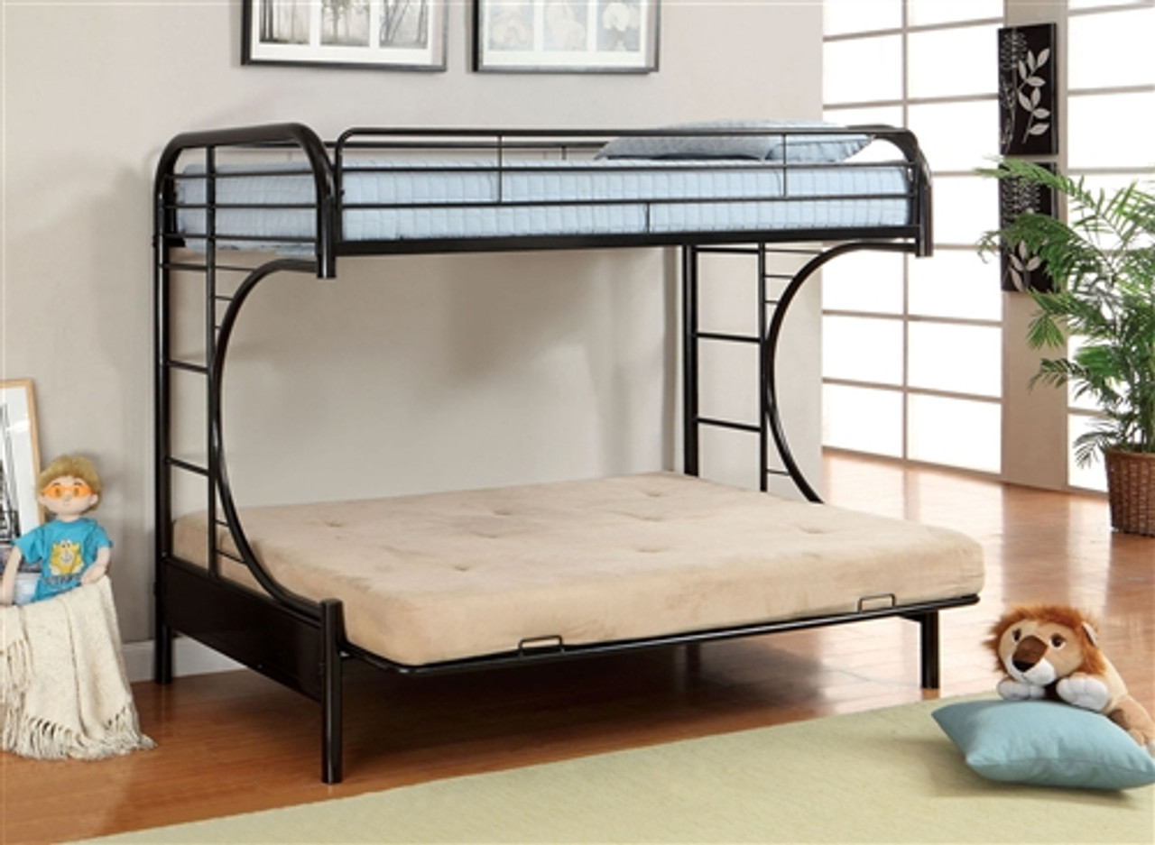 The Fontana twin futon metal bunk bed combines style and function to create a contemporary atmosphere to any kid or teens bedroom. The unit features a twin upper bed stacked over a futon base. This metal futon bunk is constructed from heavy-gauge metal and tubing for quality durability and safety. Featuring safety rails, ladder, and welded metal slat support system for mattress support.