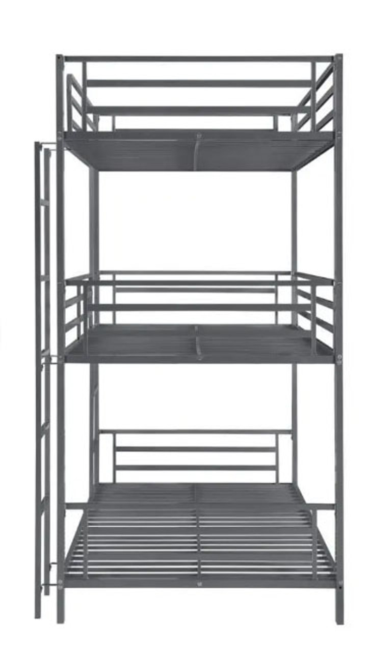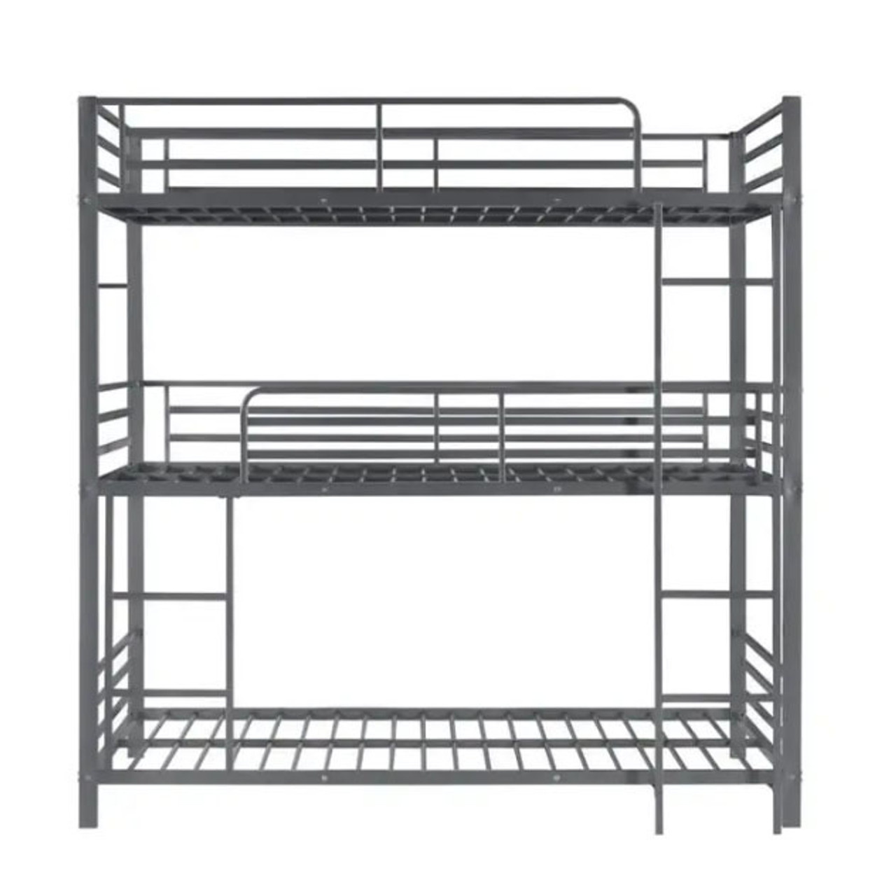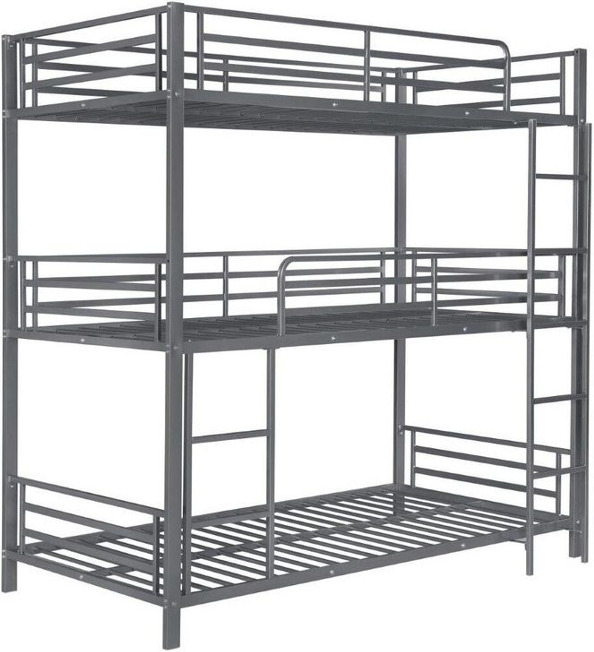 Enhance compact sleeping spaces with this 3 person high bunk bed. Featuring a twin over twin over twin configuration, there is plenty of space for large families and sleepovers. This is durably crafted from metal in a striking gunpowder finish. Sturdy safety rails protect sleepers as they snooze through the night. Little ones can easily access the top bunks with built-in and secure ladders.
