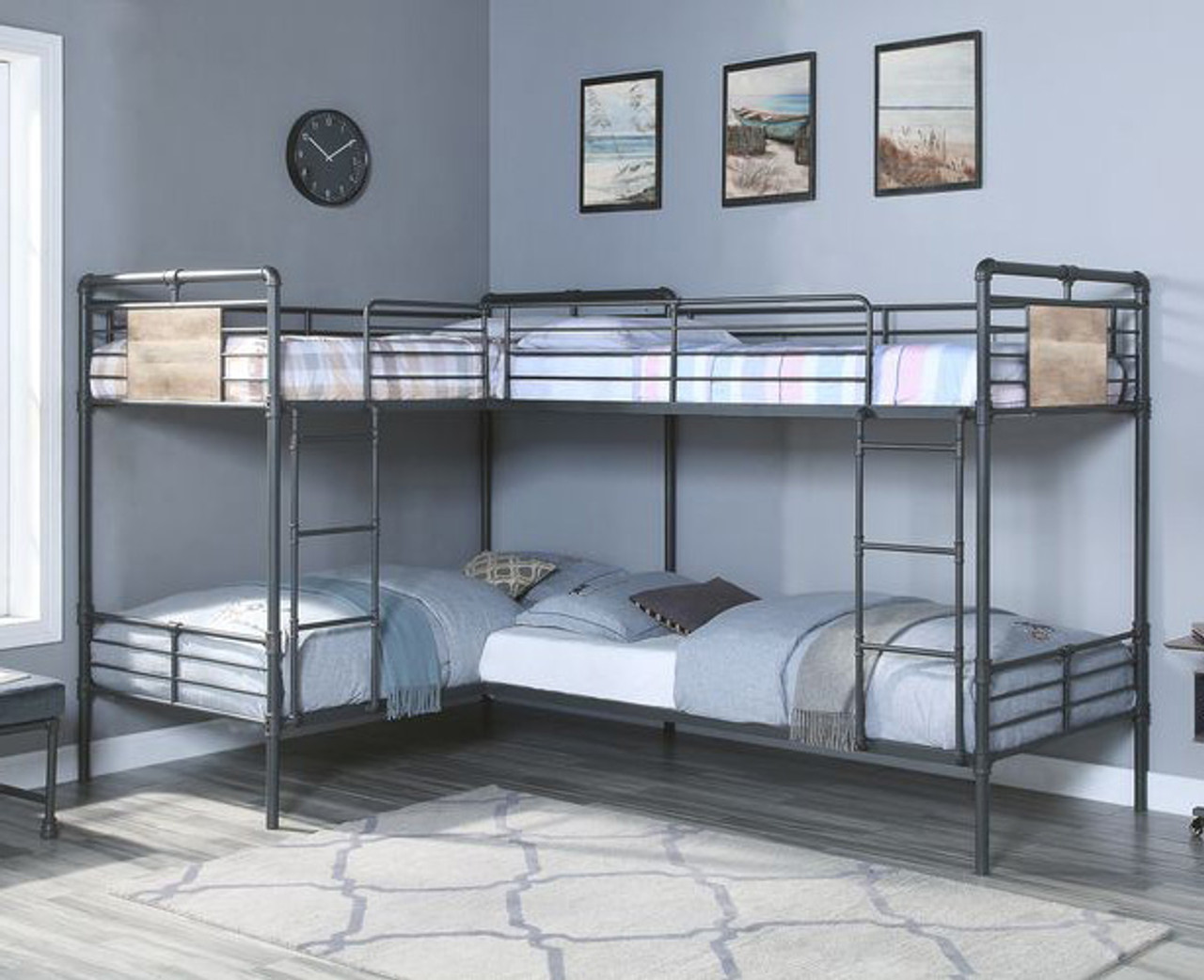 Create a bunk room in your home for fun sleepovers with the Pipe-style twin size Quad bunk beds. The cornered beds are space savers and maximizing the sleeping space. Everyone will be accommodated, perfect for out-of-town guests or ideal for those with limited bedrooms in their home. Made from sturdy metal frames for a sturdy structure. The safety guardrails ensure that children are secured while they sleep. The industrial design is accentuated with the sandy black finish and dark bronze accents.