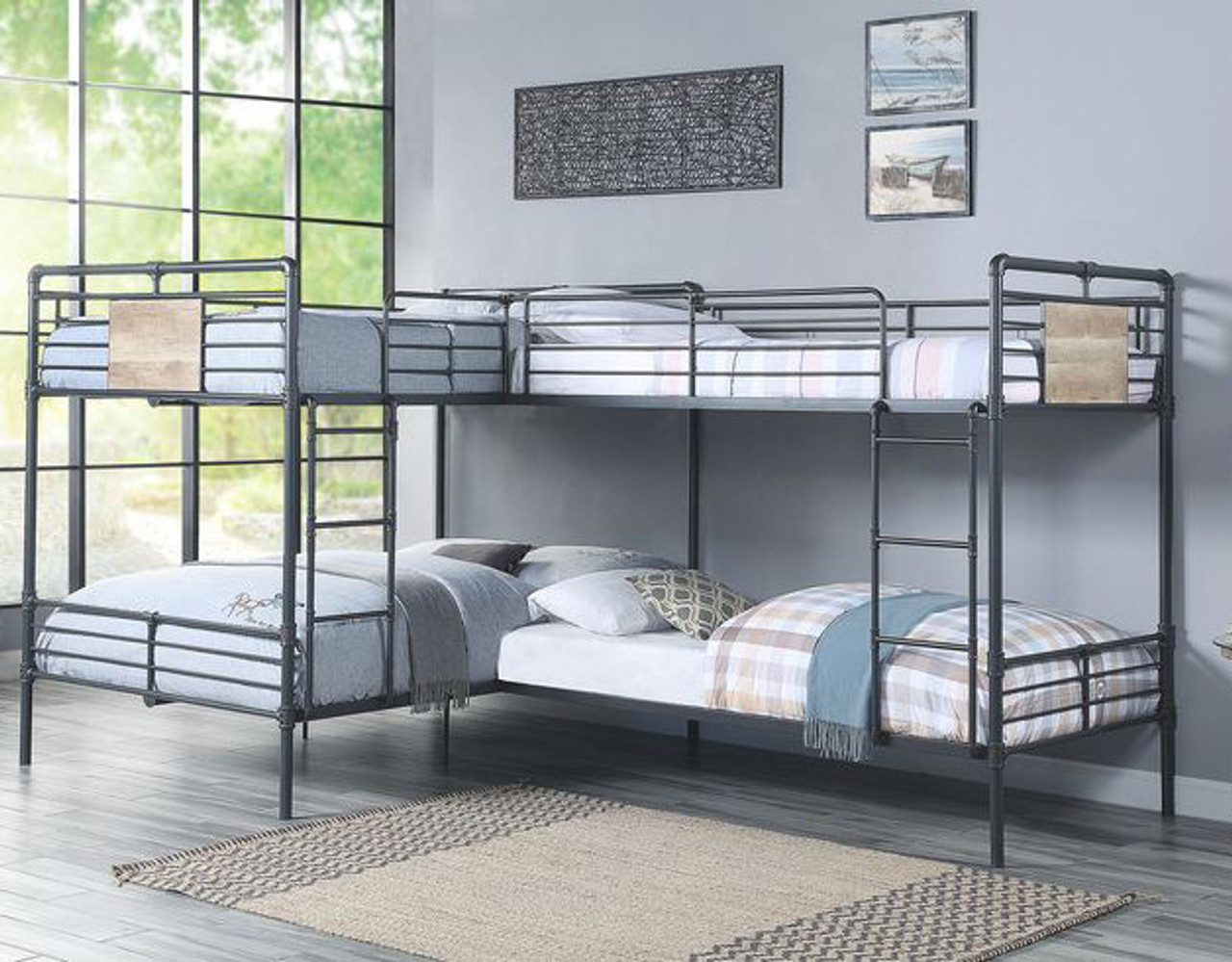 Create a bunk room in your home for fun sleepovers with the Pipe-style Quad bunk beds. The cornered beds are space savers and maximizing the sleeping space. Everyone will be accommodated, perfect for out-of-town guests or ideal for those with limited bedrooms in their home. Made from sturdy metal frames for a sturdy structure. The safety guardrails ensure that children are secured while they sleep. The industrial design is accentuated with the sandy black finish and dark bronze accents.