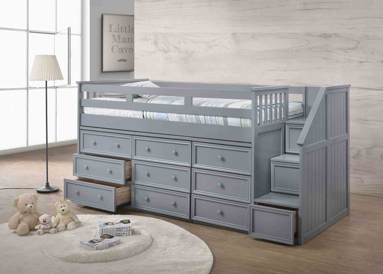 Style and functionality meet to create the Laguna Junior Low Twin Loft Bed with Storage Steps . This is an eye-drawing loft that makes itself the main focal point to any room. Featuring a twin size bunk and storage steps for ease of access. This unit is constructed from quality solid wood and bead board paneling with a protective lacquer coat finish. Additional features include safety rails and metal to metal connections for durability and strength.