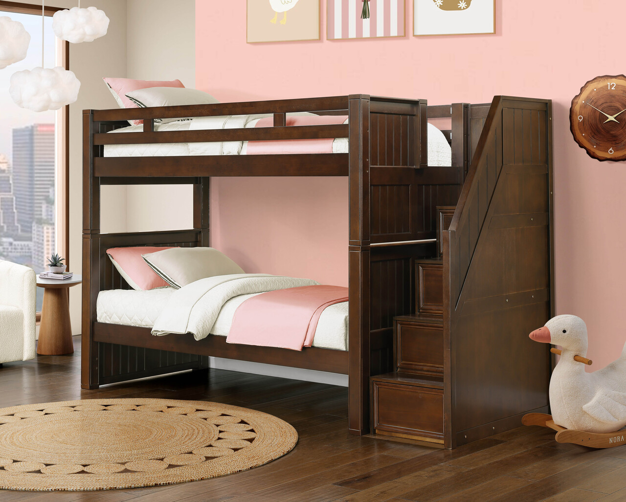 Introducing the Dillon white twin bunk bed with stairway storage. Featuring top quality Eco-friendly solid hardwood and bead board accents construction. The space saving design makes this bed perfect for youth, teens, and college students. Featuring privacy bead board paneling and a stairway that can be placed on either side of the bunk. Four storage drawers of different sizes are built underneath the stairs perfect for storing bed sheets, blankets and other items. Additional features include safety rails, metal to metal connection for structural strength, and under bed slat support system. This versatile bunk can be converted into two separate twin-size beds. Want to increase functionality? Optional trundle bed is perfect accommodating overnight guests. Optional under bed drawers offer extra storage space. Customize your room even further by adding any of these set pieces: 6-drawer dresser, 2-drawer night stand, 5-drawer chest and desk.