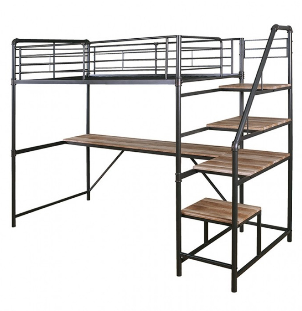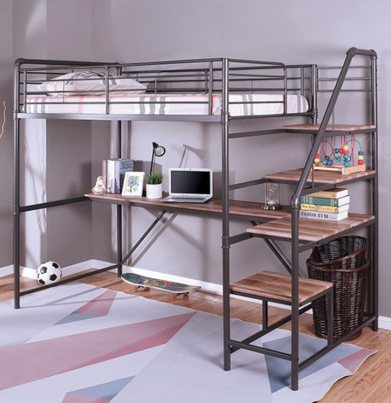 This industrial style pipe-like bed and workstation below is the perfect choice for the studious son or daughter! The built-in desk with a beautiful replicated wood top. To the right of the desk is more shelf storage, which also doubles as the staircase to access the top bunk. Industrial accents such as piping and hand-brushed copper finishes complement the sand-blasted black paint of the metal frame.