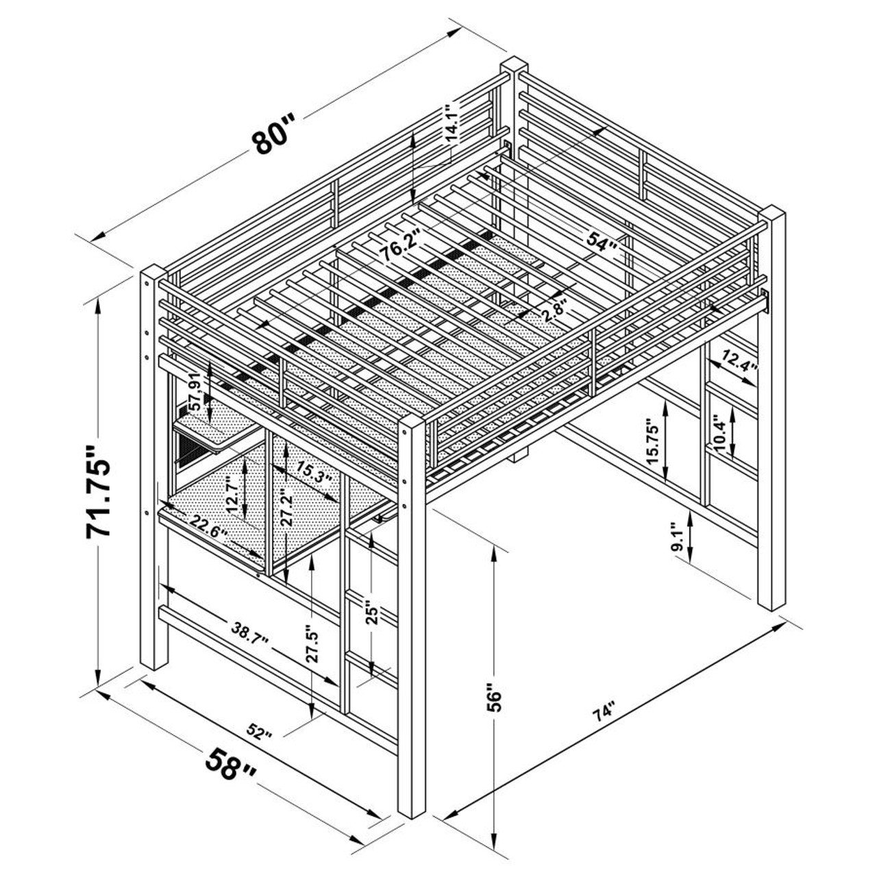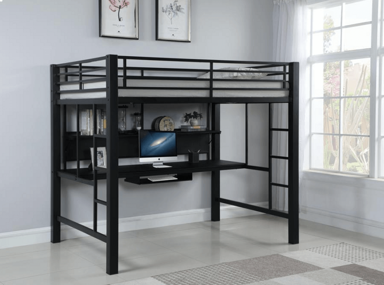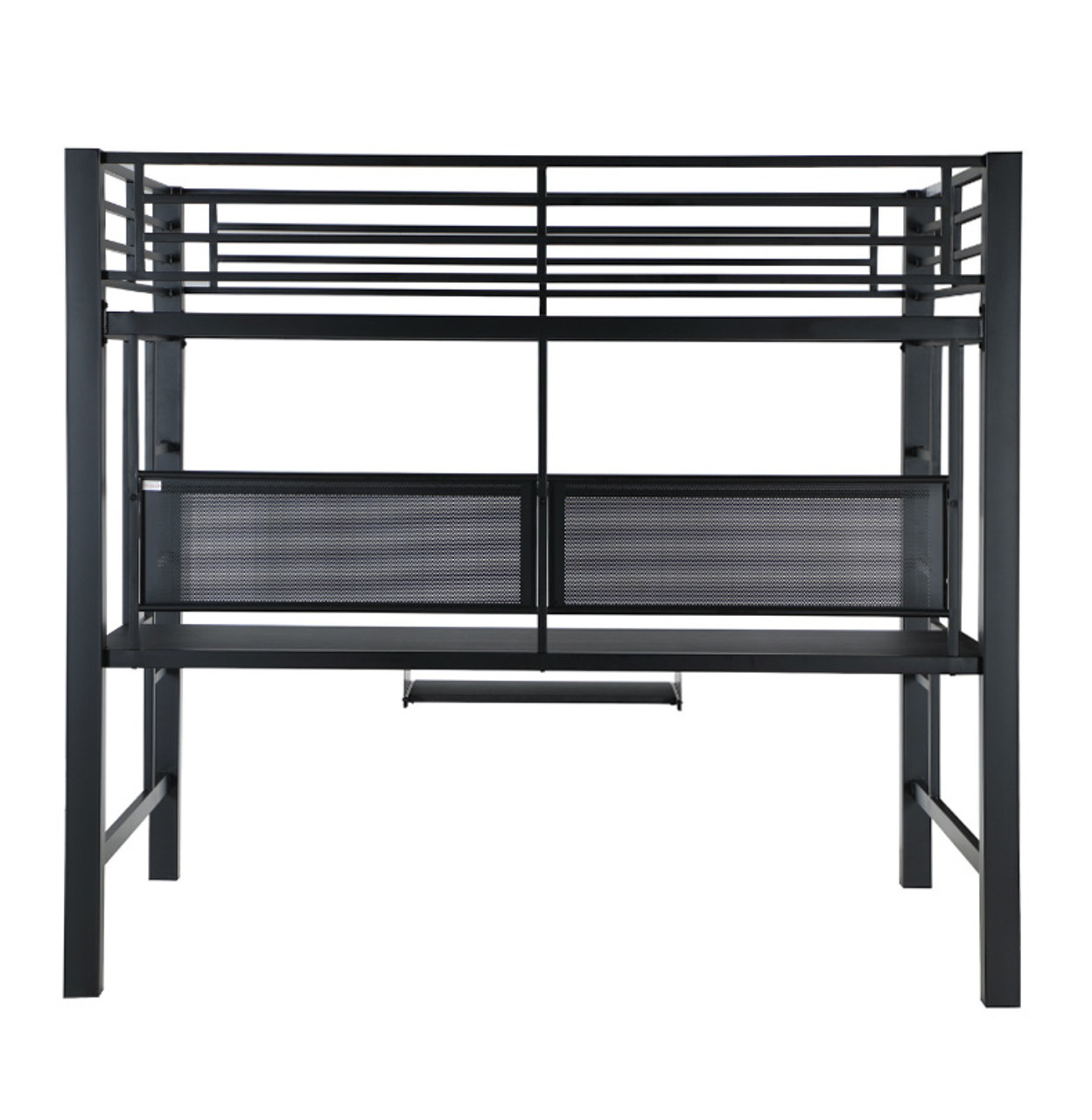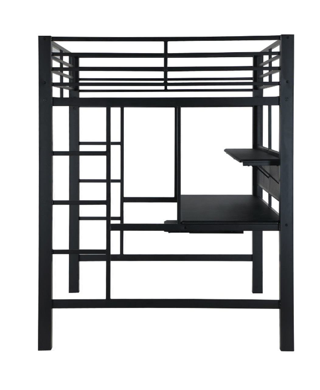 Functionality meets style with the Adam black metal tube full loft bed. This is the ideal bed for growing youth, teens and college students that enjoy a sleep space bigger than a twin size. Featuring clean straight lines, 3" post metal construction that comes in a black finish, and a full length desktop below with keyboard tray and upper shelf storage. Other features include safety guardrails and built-in ladder on both sides.