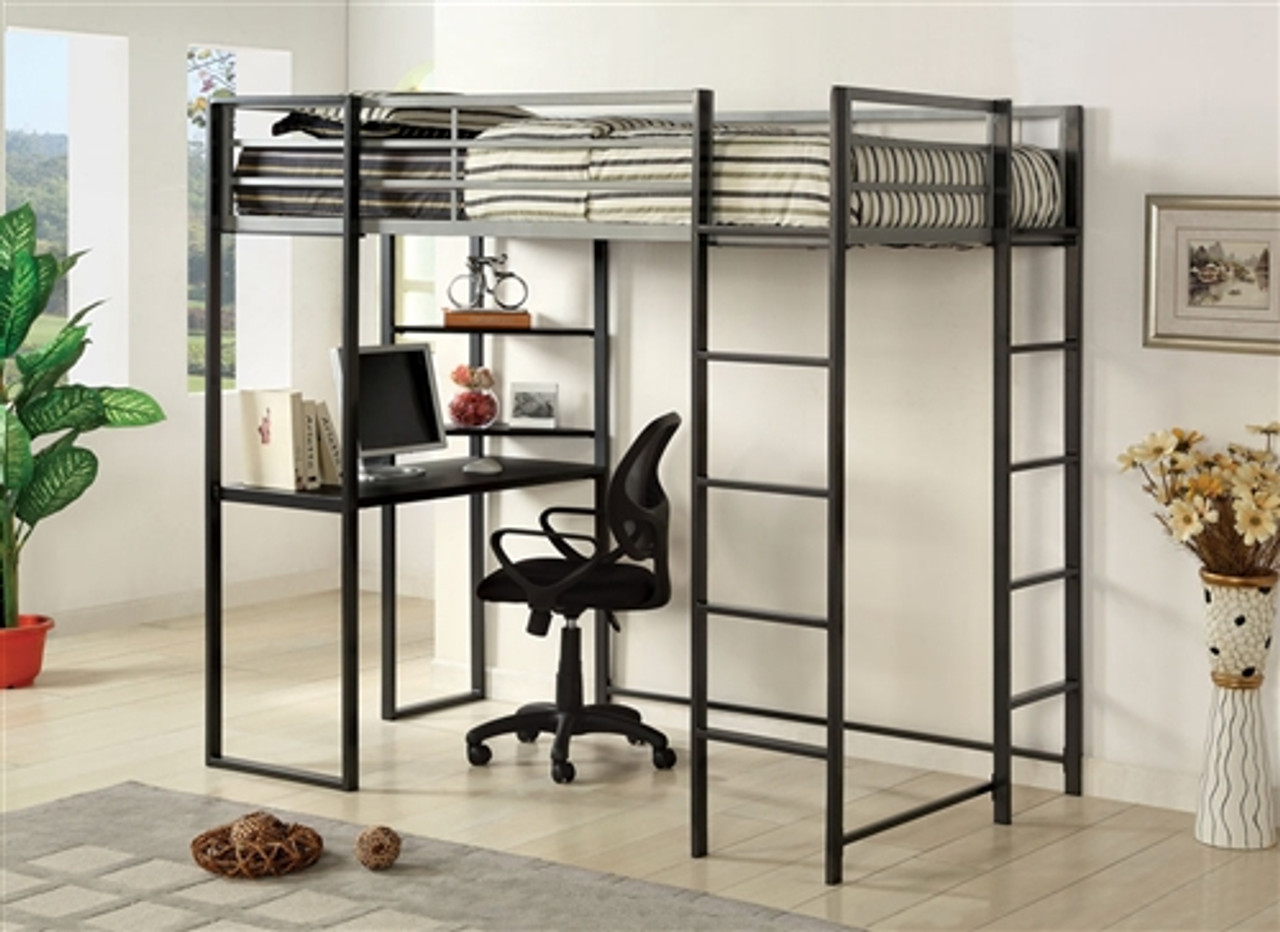 The Cooper silver gun metal twin workstation loft bed provides a comfortable sleep space and work area all in one. Featuring a contemporary design constructed from heavy-gauge metal tubing that comes in a silver gun-metal finish. Under the sleep area is the space-efficient workstation desk with shelves perfect for laptops and school work. Additional features include safety guardrails, built-in ladder, and sturdy metal slat system for mattress support. Mattress is not included.