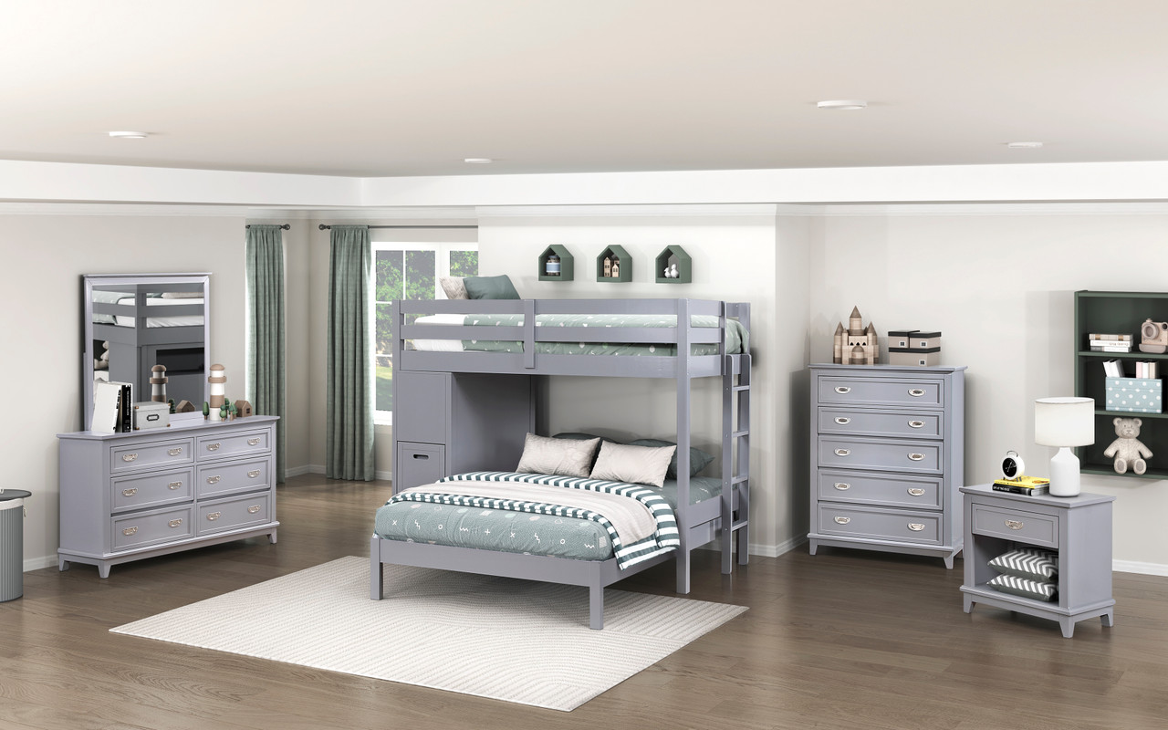 Maximize your child's bedroom space with this multifunctional Brooks loft bunk bed, designed for both style and practicality. Crafted from wood and engineered wood with a sleek finish, this bunk bed features a top twin bunk with guard rails for safety and a full-size lower bed. The built-in storage unit includes seven dovetail drawers with smooth ball-bearing glides for organized storage, and a hidden desk on casters that easily rolls out for study or creative activities. Polished nickel-tone flush ring pulls add a touch of sophistication, and the design eliminates the need for a foundation or box spring, making it a space-saving and efficient choice for any bedroom.