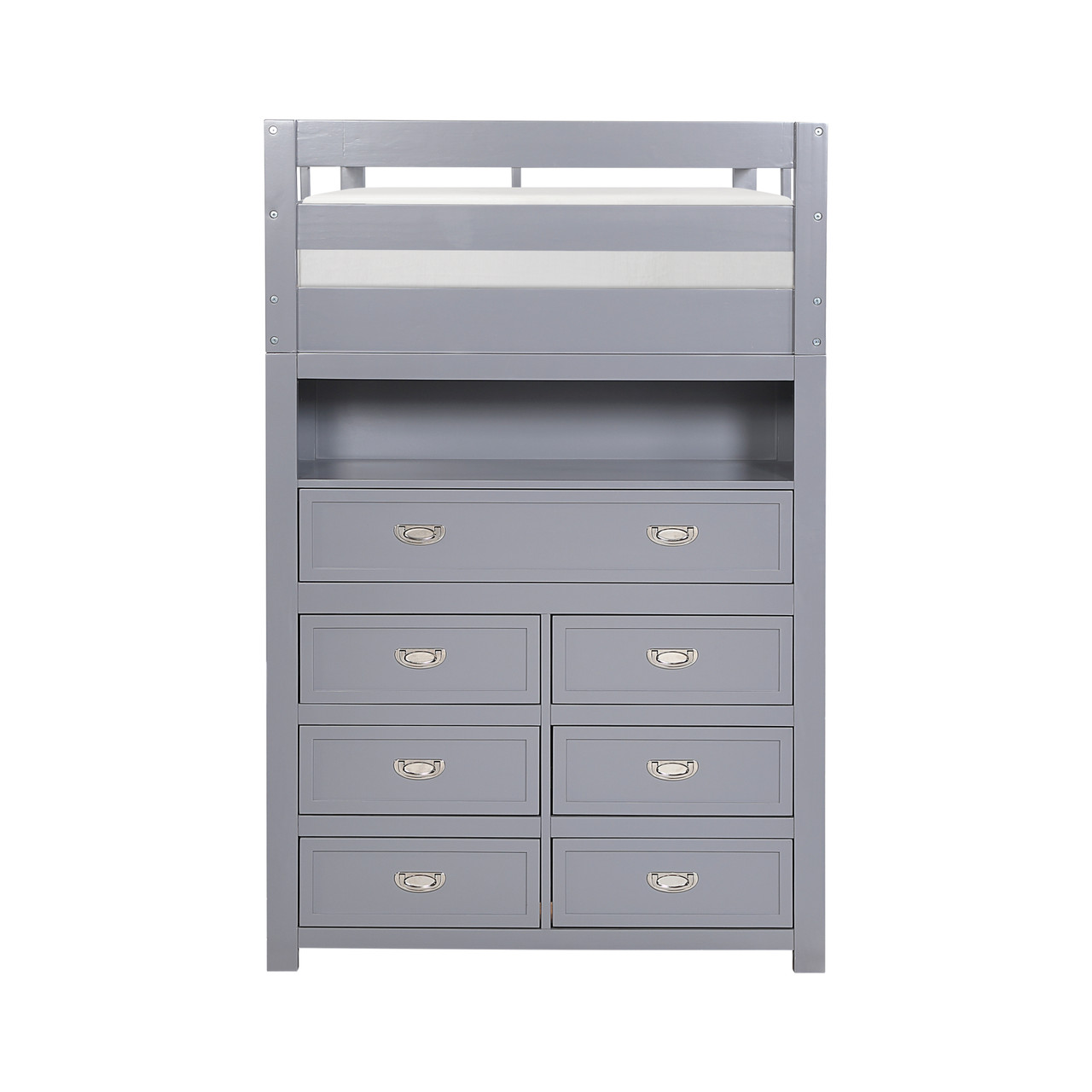 - Loft bed includes upper and lower bed, built in chest with 7 drawers and pullout desk.