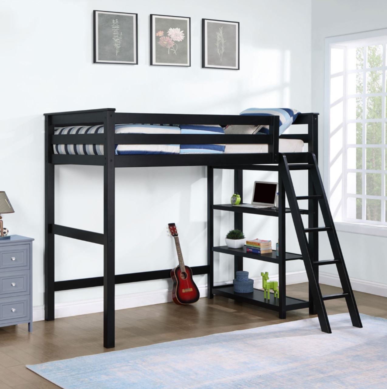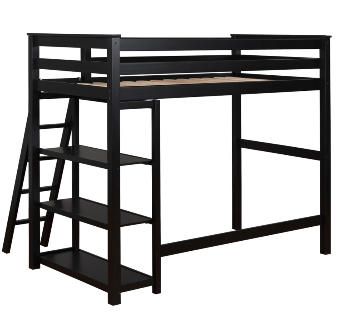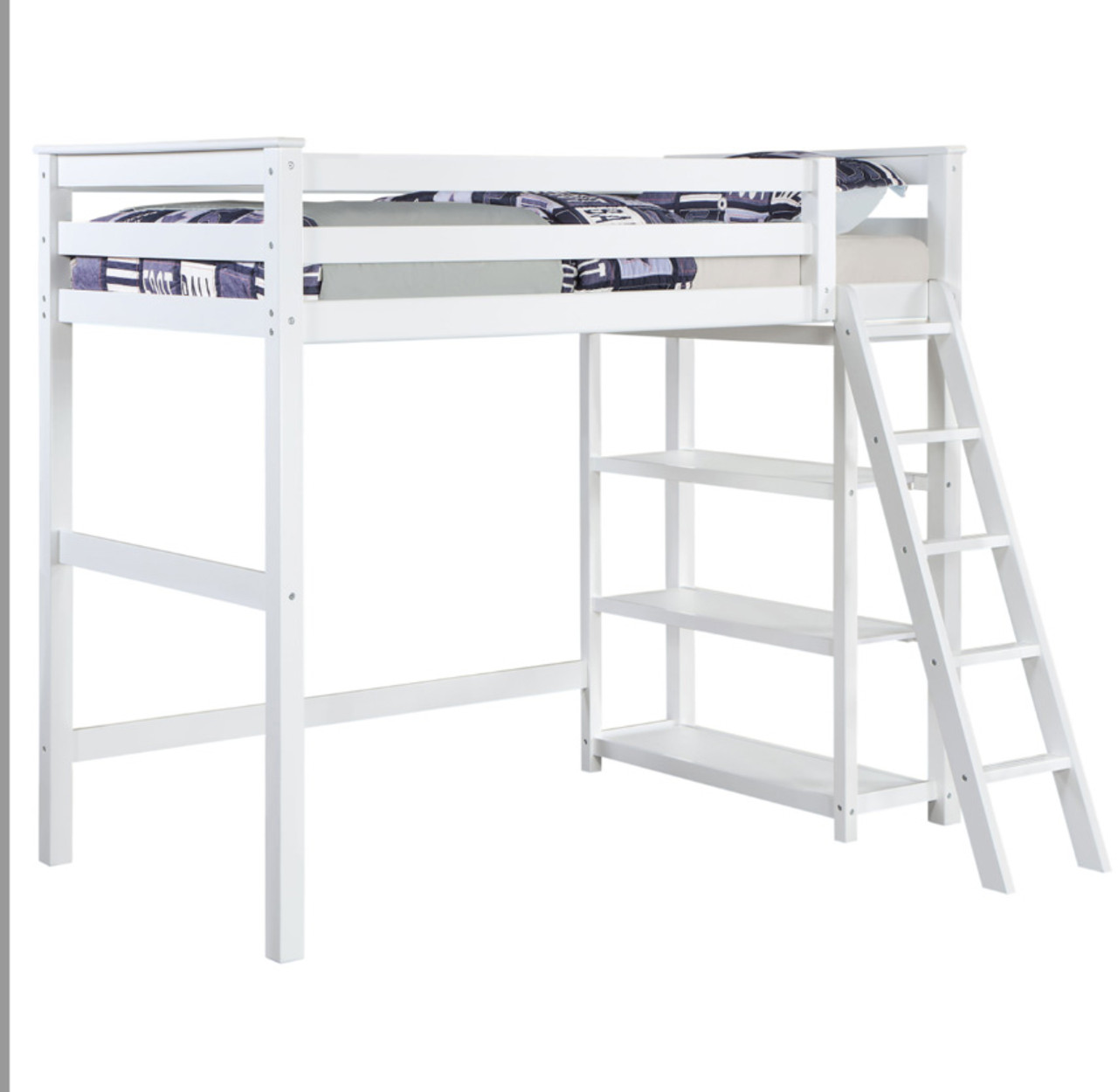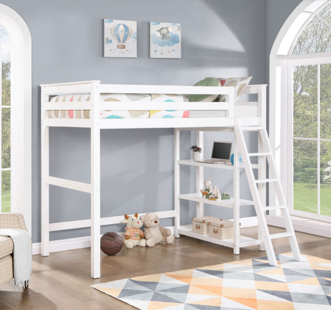 Turn your child’s or teen’s bedroom into a center of organization with this twin size workstation loft bed. Expanding on the space-saving features of a bunk bed, this unit creates an entire sub-space for sleeping, studying, and reading. Plywood and melamine laminate creates a lightweight yet sturdy design, beginning with a top loft bed protected by horizontal guardrails. A slanted ladder adds easy bed access, as an open space under its bed and side shelving makes room for a desk, bean bag, books, and supplies. Save room in a smaller bedroom, or double up to accommodate two of these chic beds in one room.