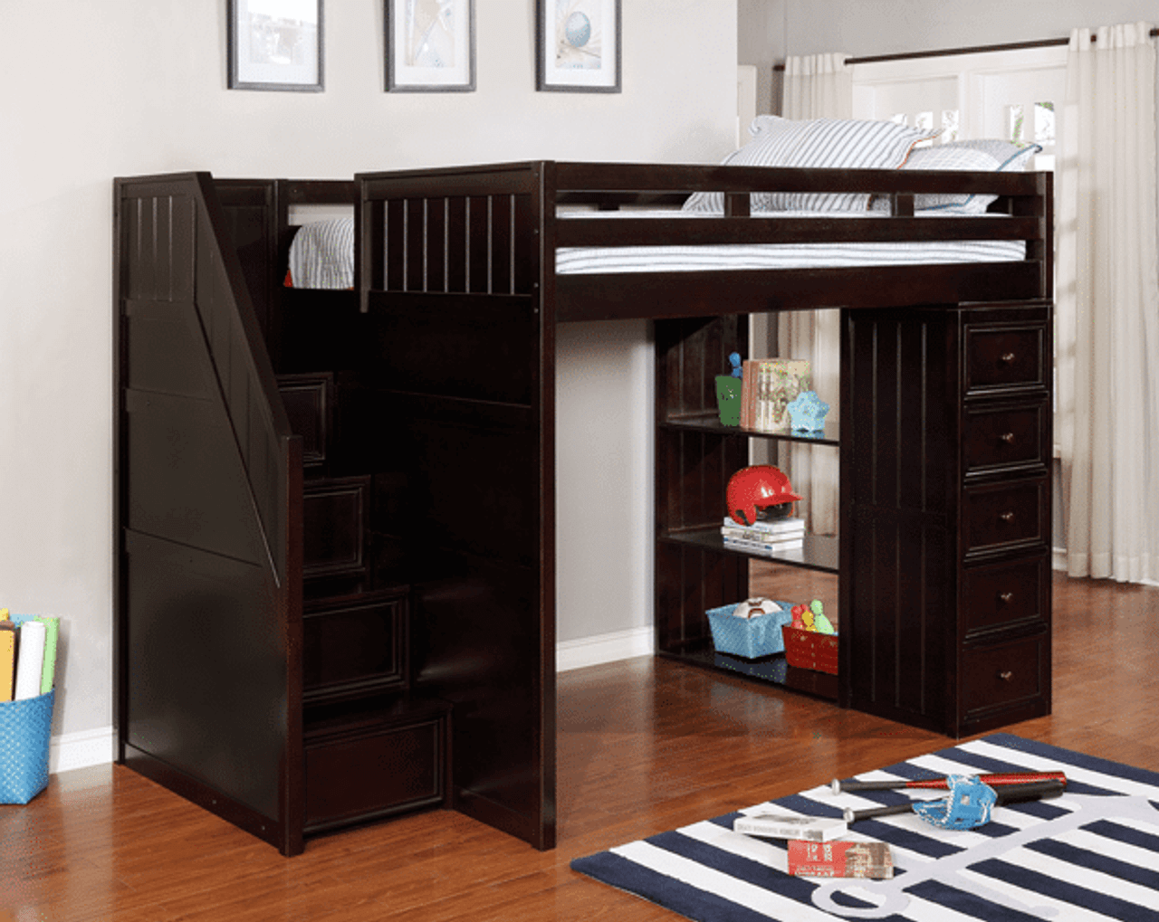 The Dillon Twin loft bed with stairs storage chest is the perfect blend of style and functionality. It has a bold presence that commands attention while also adding a contemporary feel to any youth/ teen bedroom. Construction features Eco-friendly solid hardwood along with stylish bead board paneling. The main features include a unique stair system with a built-in drawers as well as a desk. English dove tail construction ensures the strength of the storage drawers. The upper bed is adorned with safety guardrails for protection and metal-to-metal connections for added durability. Comes with full rolls of under bed slats, barrel nut hardware for quality warp-free bed rails with ply construction. Bottom Bed is sold separately