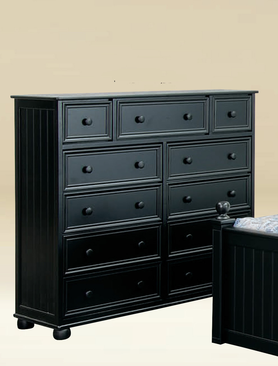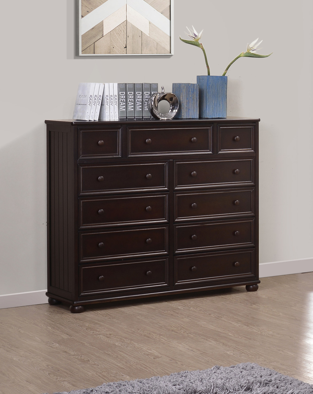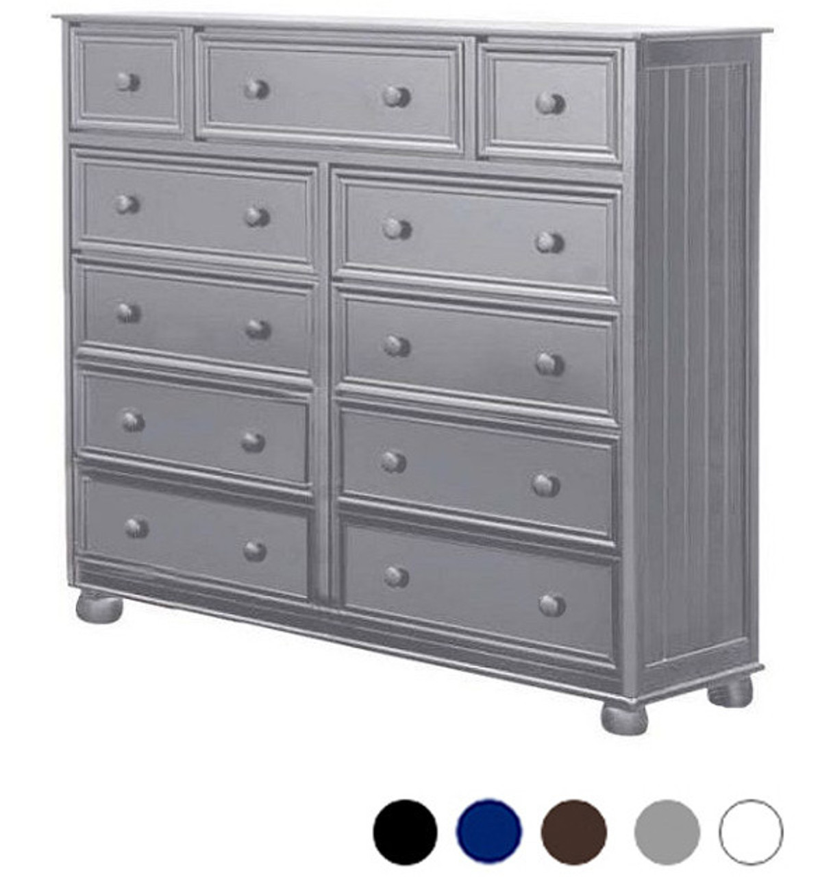 This is the beautiful Dillon 11-drawer chest of drawers. Looks great with any loft or bunk bed. Crafted from Eco-friendly solid hardwood, bead board paneling, and comes in Navy blue, black, espresso, white, and gray finish. Featuring five drawers for extra storage space, wooden knob accents, and stylish bun feet. Chest is fully assembled.