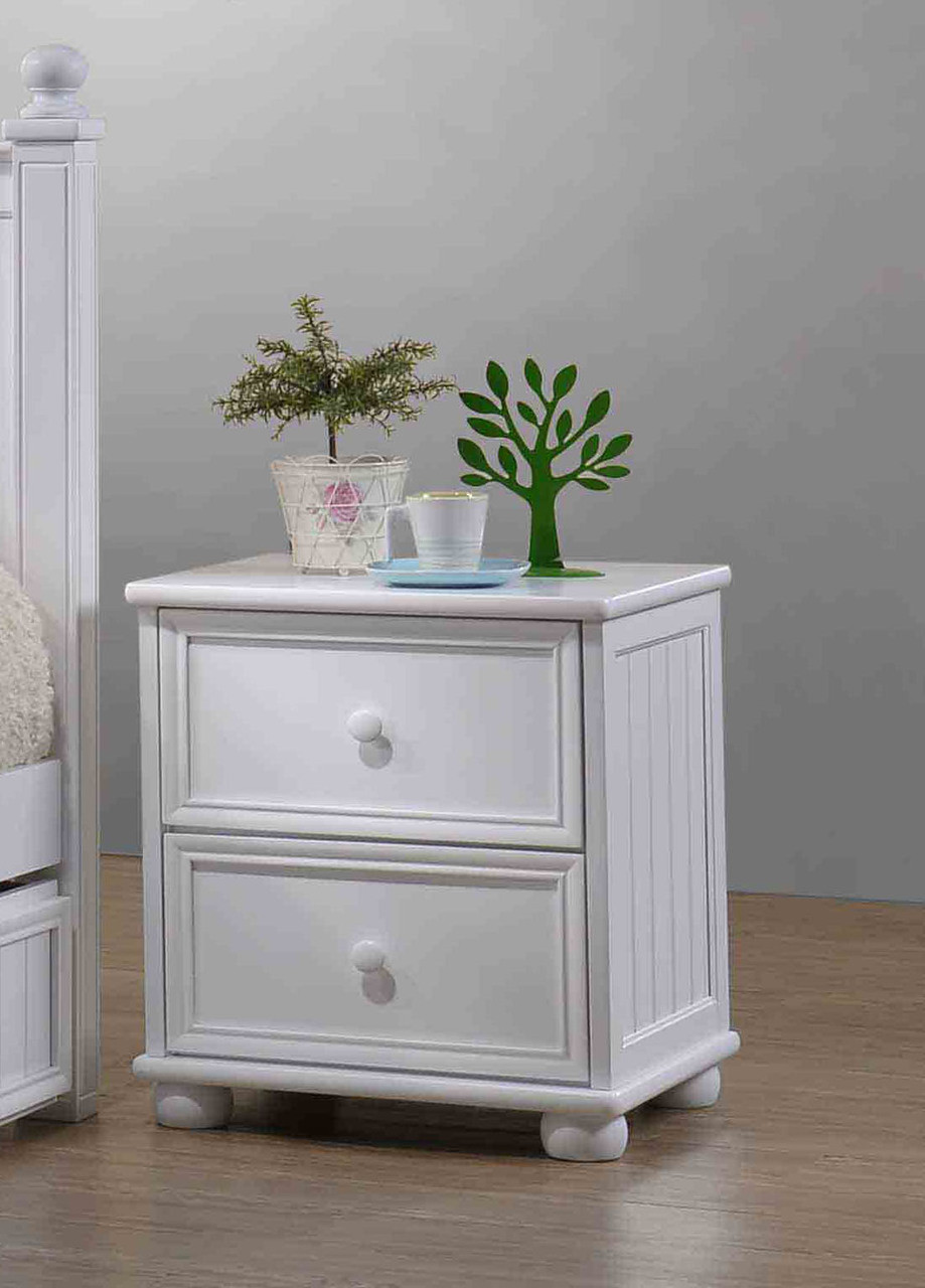 This is the beautiful Dillon two drawer night stand. Looks great with Dillon bead board bunk and loft bed. Crafted from Eco-friendly solid hardwood, bead board paneling, and comes in a stunning navy blue finish. Featuring two storage drawers, wooden knob accents, and stylish bun feet. Also available in a black, white, antique oak, espresso, navy blue and gray.