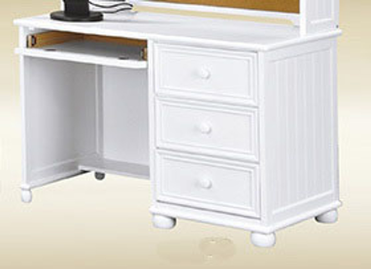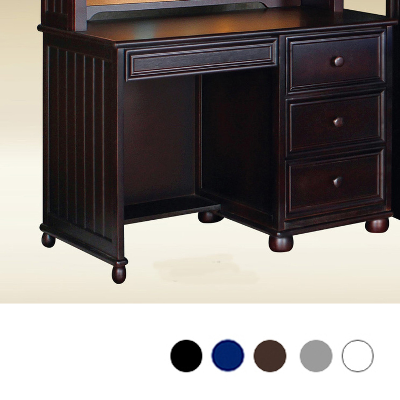 This is the beautiful Dillon bead board computer desk. Perfectly complements any bunk bed or student loft bed. Crafted from Eco-friendly solid hardwood, bead board paneling, and is available in espresso, white, black, navy blue, and gray finish. Featuring three drawer storage, dovetail construction, keyboard tray, euro rails, corner blocks and wooden accent knobs.