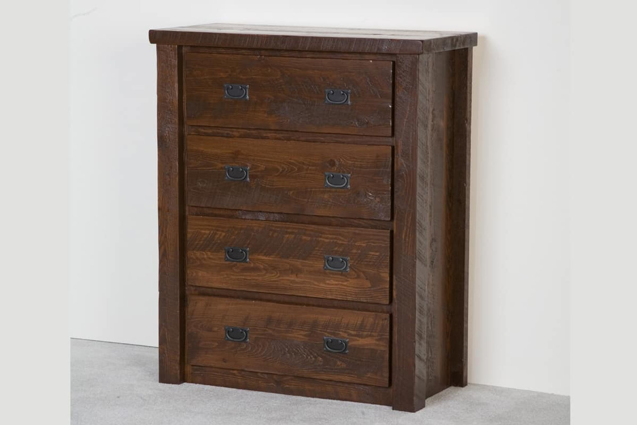 The Lodge barnwood 4-drawer chest offers a lot of storage. The four drawers are wide and deep for all kinds of clothing. Add the barn wood chest of drawers to any farmhouse or rustic bedroom. All the Lodge barnwood furniture is made from rough sawn pine lumber to replicate the reclaimed barnwood look at an affordable price. The solid pine timbers used to make this piece still has many of the original saw blade marks in them from the mill.