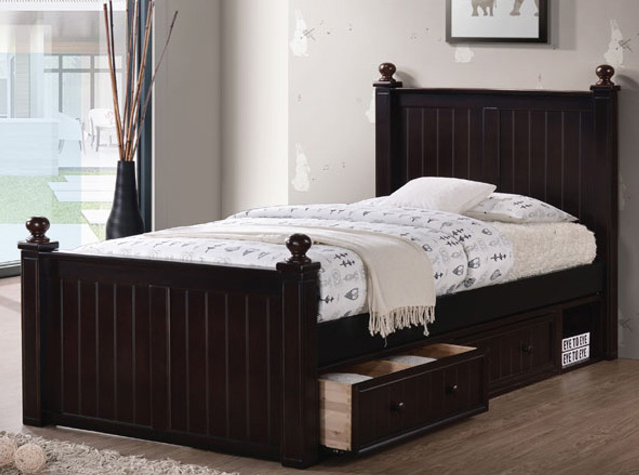 Decorate your child's room with this beautiful twin size bed. Constructed from Eco-friendly solid hardwood and bead-board panel, available in navy blue, white and gray. The bed comes with slat support. Add under bed drawers for additional storage space or add under bed trundle for extra sleeping option.