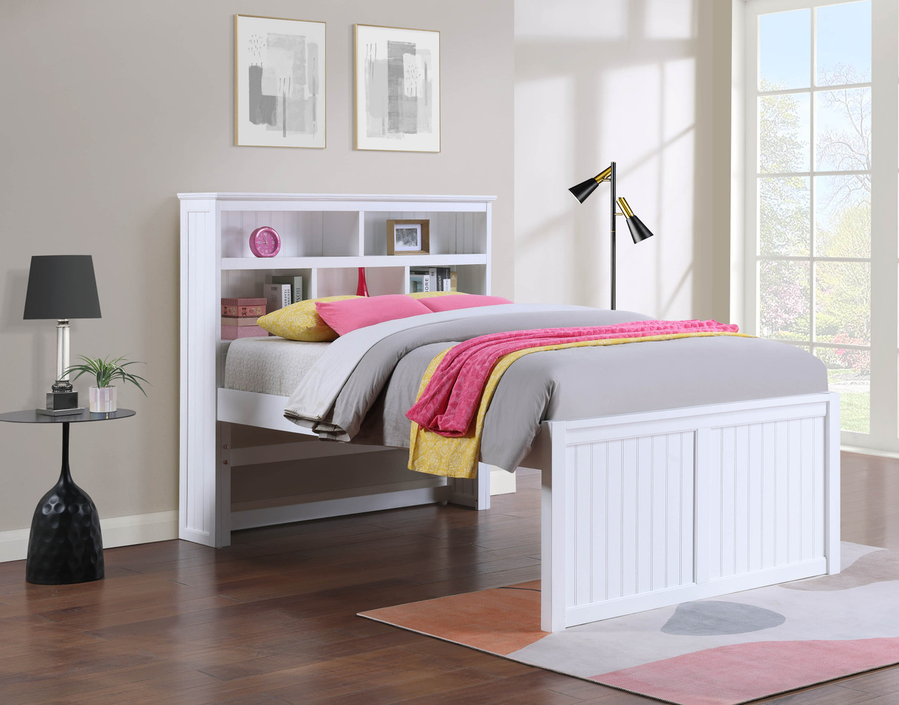 Introducing the Dillon bead board full bookcase captain's bed. This captain's bed effortlessly combines great design and functionality. It features Eco-friendly solid hardwood and bead-board detailing, available in black, navy blue, espresso and white. The bed comes with a bookcase headboard featuring open cubbyholes that provide storage for books or bedtime needs. A perfect fit for teen youth and adults. Looking to add additional storage, you can add a set of 4 drawers on one side, or add two sets of drawers one on each side. Matching dresser, 5-drawer chest, desk, night stand are available under matching accessories. Some assembly is required.