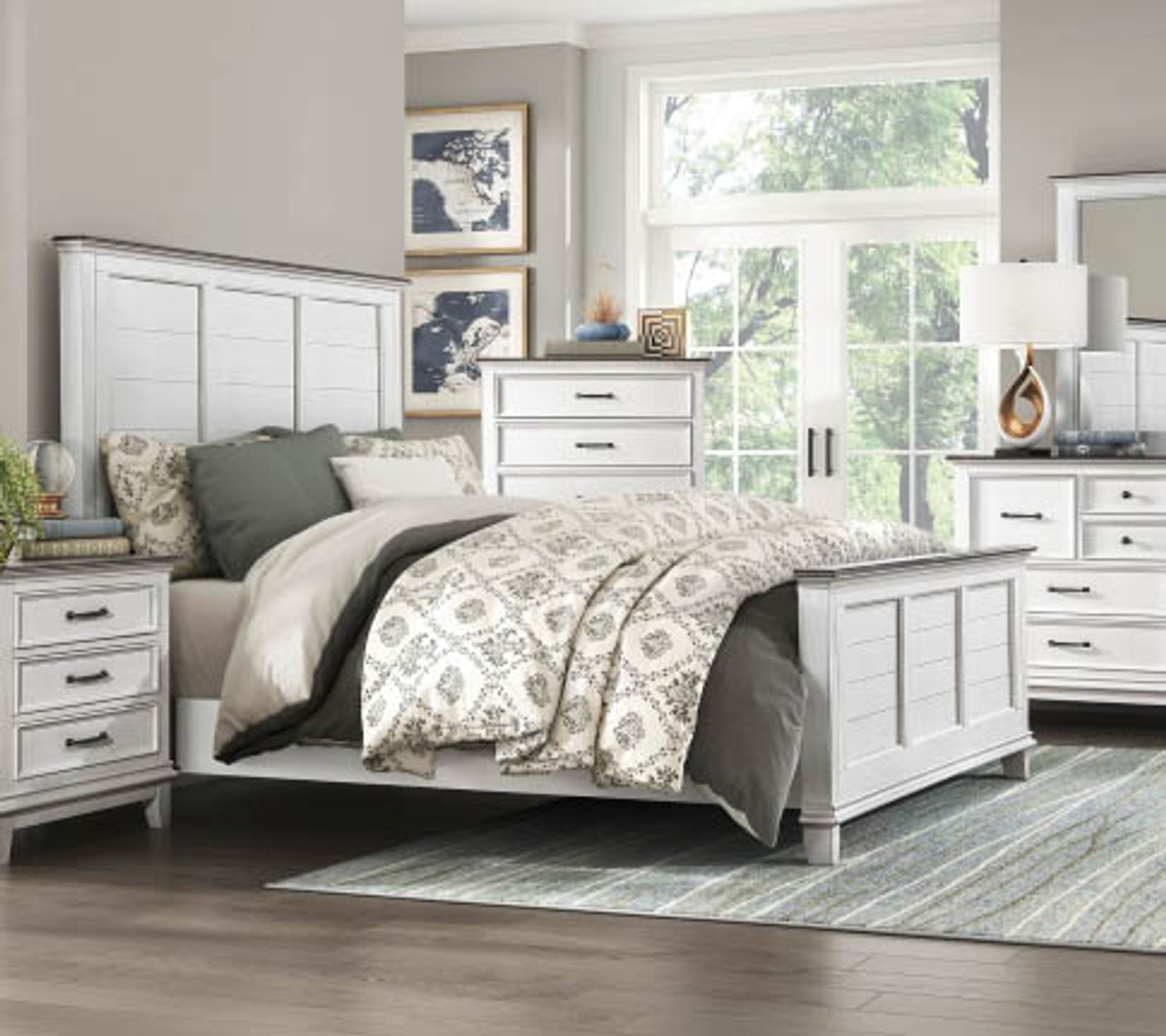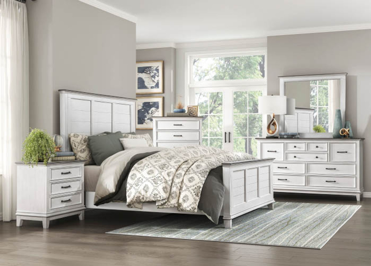 Exuding the aesthetic of casual country living, the Hutchinson Collection’s classic lines create a look that perfectly captures your preference for farmhouse design. The two-tone finish of the queen bed is a warm contrast of dark brown and antique white. The panel design of the headboard and low profile footboard features classic framing, presenting a versatile look and bold centerpiece for your bedroom.