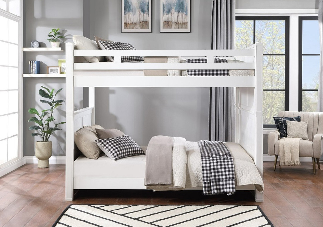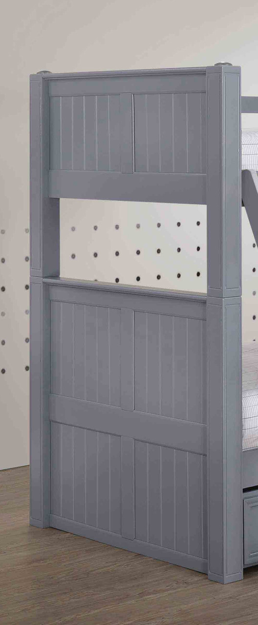Introducing the Dillon twin XL dual height bunk bed w/ straight ladder on end. This updated version includes a space saving side-mounted ladder for ease of access to upper bed, a dual height setting bottom rail, the first setting is 4 inches off the floor, creating a head clearance of 43", or a second height 12 inches off the floor creating a clearance of 35". The sturdy XL twin over XL twin size makes this bed perfect for youth, teens, and college students. Featuring privacy bead board paneling, hidden hardware for clean look. Additional features include stylish safety rails, vertical ladder attached to headboard, metal to metal connection for structural strength, and under bed slat support system making it mattress-ready. The space saving bunk can be converted into two charming extra long twin beds. Want to increase functionality? A perfect-position lower rail system ensures room for optional under bed trundle or storage drawers with bookcase. Don't like the color? Additional color options include: Black, white, espresso, navy blue, and gray. Customize your room even further by adding any of these set pieces: 6-drawer chest, 2-drawer night stand, 5-drawer chest, and under bed trundle.