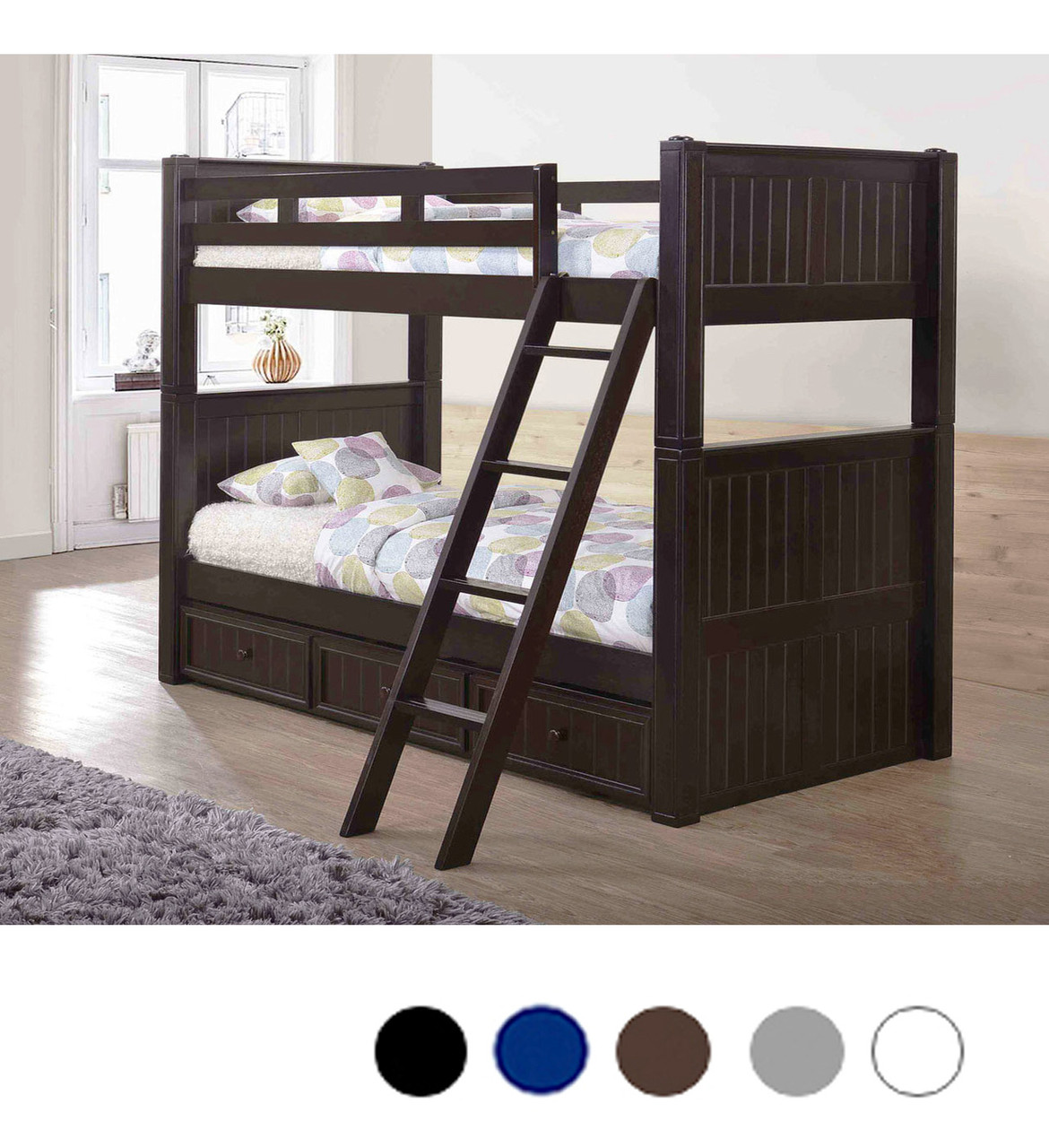 Optional features include an under-bed trundle or storage drawers, available in additional colors such as black, white, espresso, navy blue, and gray. Enhance your space further with matching accessories like a 6-drawer chest, 2-drawer nightstand, 5-drawer chest, or an under-bed trundle.