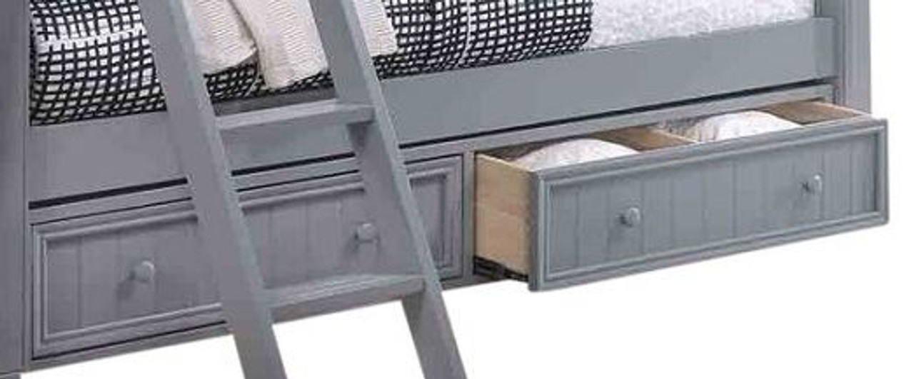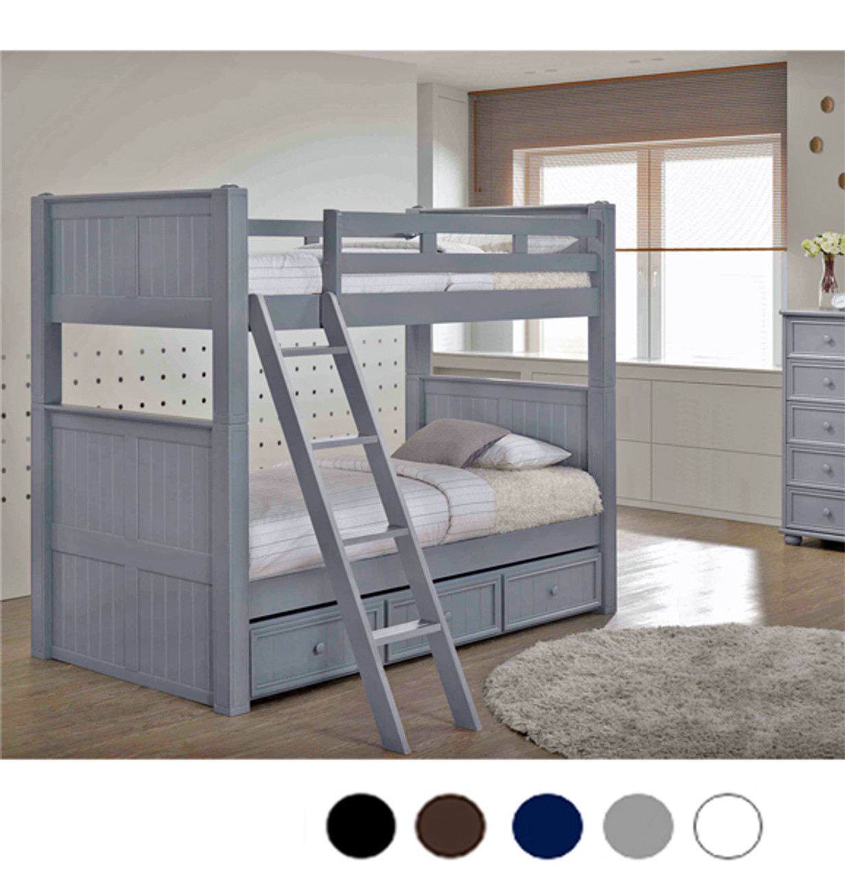 The Dillon wood twin bunk bed features a classic and timeless look that appeals to children, teenagers and college students alike. Sturdy and extremely durable design constructed from top quality Eco-friendly solid hardwood and bead board paneling, in a beautiful gray finish. Other features include privacy panels, 3-inch posts, upper bunk safety railing, ladder with 3" wide grooved steps, metal to metal connections, and slat support system. This bunk can be converted into two individual twin beds if desired. Add functionality to this bed by adding under bed drawers for a more space-saving option. You also have the choice to customize it by adding matching case pieces that can complete the look.