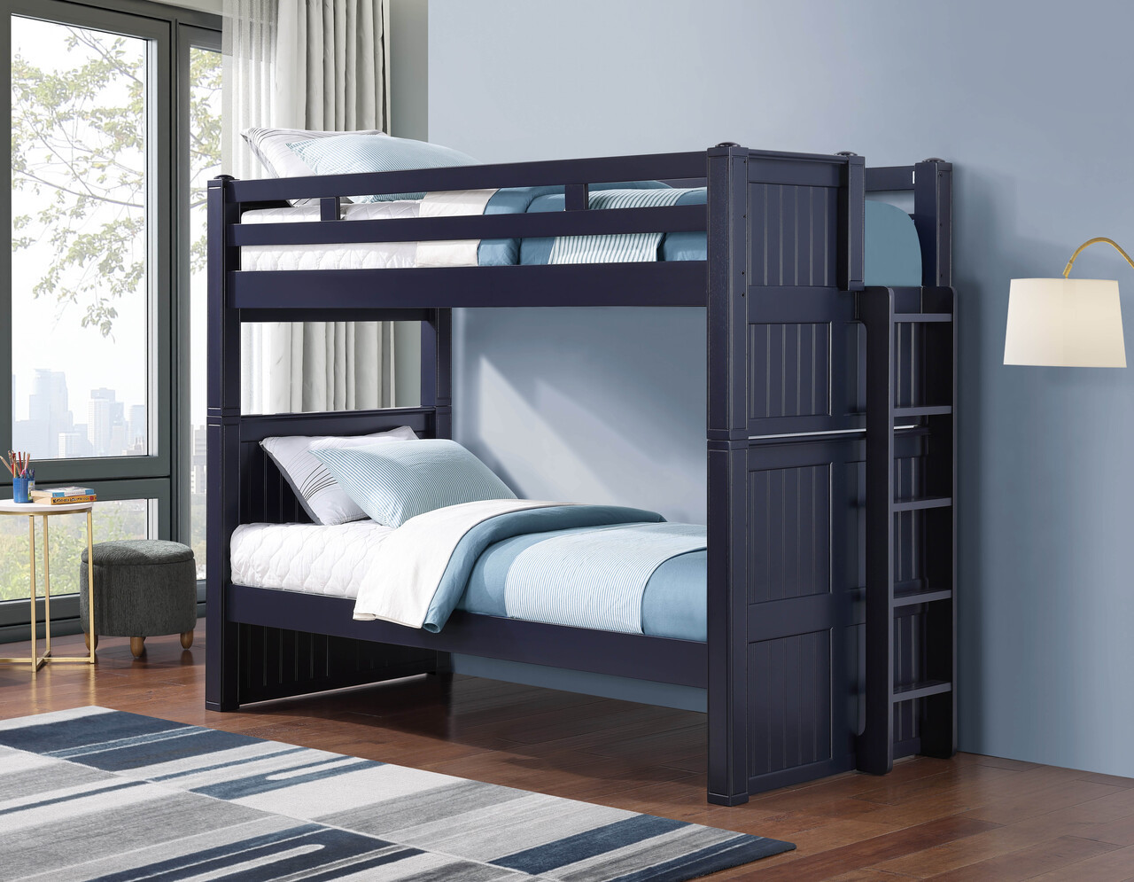 Introducing the Dillon twin dual height bunk bed w/ straight ladder on. Featuring Eco-friendly solid hardwood and bead board construction. The sturdy twin over twin size makes this bed perfect for youth, teens, and college students. Featuring privacy bead board paneling, hidden hardware for clean look. Additional features include stylish safety rails, vertical ladder attached to headboard, metal to metal connection for structural strength, and under bed slat support system making it mattress-ready. The space saving bunk can be converted into two charming extra long twin beds. Want to increase functionality? A perfect-position lower rail system ensures room for optional under bed trundle or storage drawers with bookcase. Don't like the color? Additional color options include: Black, white, espresso, navy blue, and gray. Customize your room even further by adding any of these set pieces: 6-drawer chest, 2-drawer night stand, 5-drawer chest, and under bed trundle.