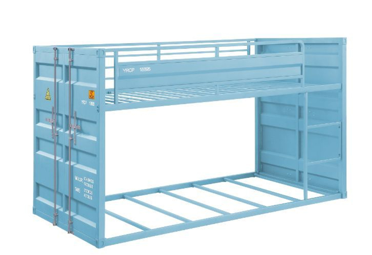 Introducing the Cargo Low Profile Twin Bunk Bed. Featuring cargo container theme headboards and foot boards. The low profile twin size bed is perfect for a low ceiling room. The space saving low height bunk makes it perfectly safe for kids of all ages to access the upper unit. Other details include metal to metal connection for structural strength, and under-bed slat support system making it mattress-ready. The bed is available in red, Aqua, gunmetal finish.