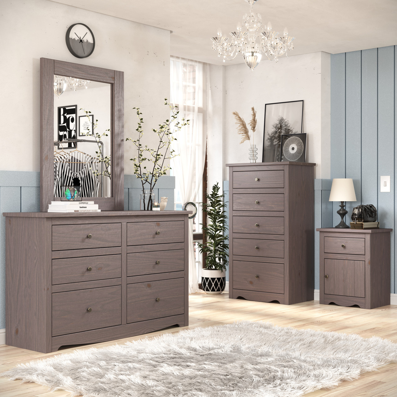 - Rustic Finishes available in Mahogany Brown, Charcoal-gray, and antique white distressed