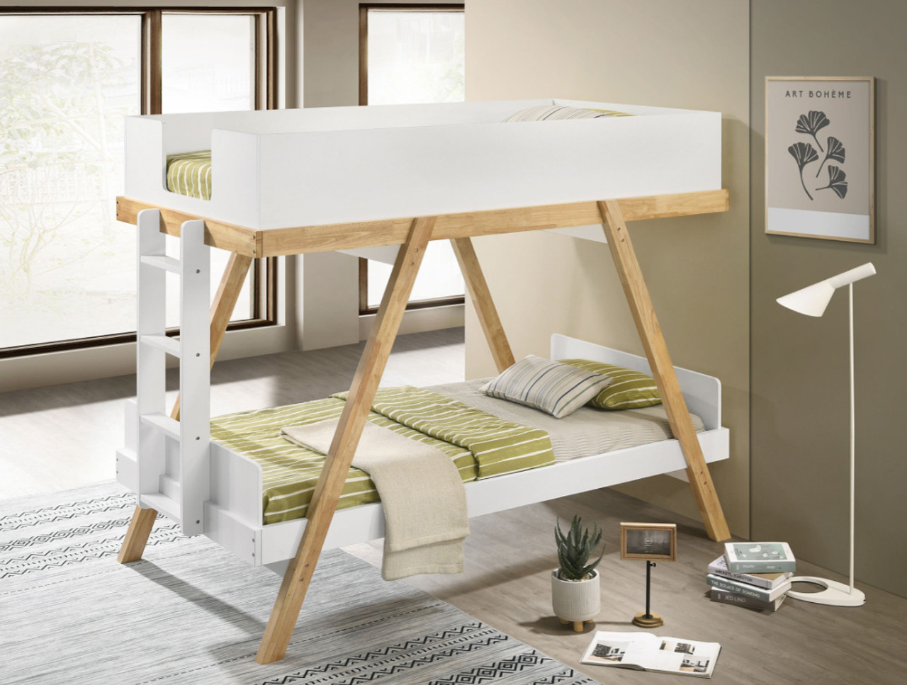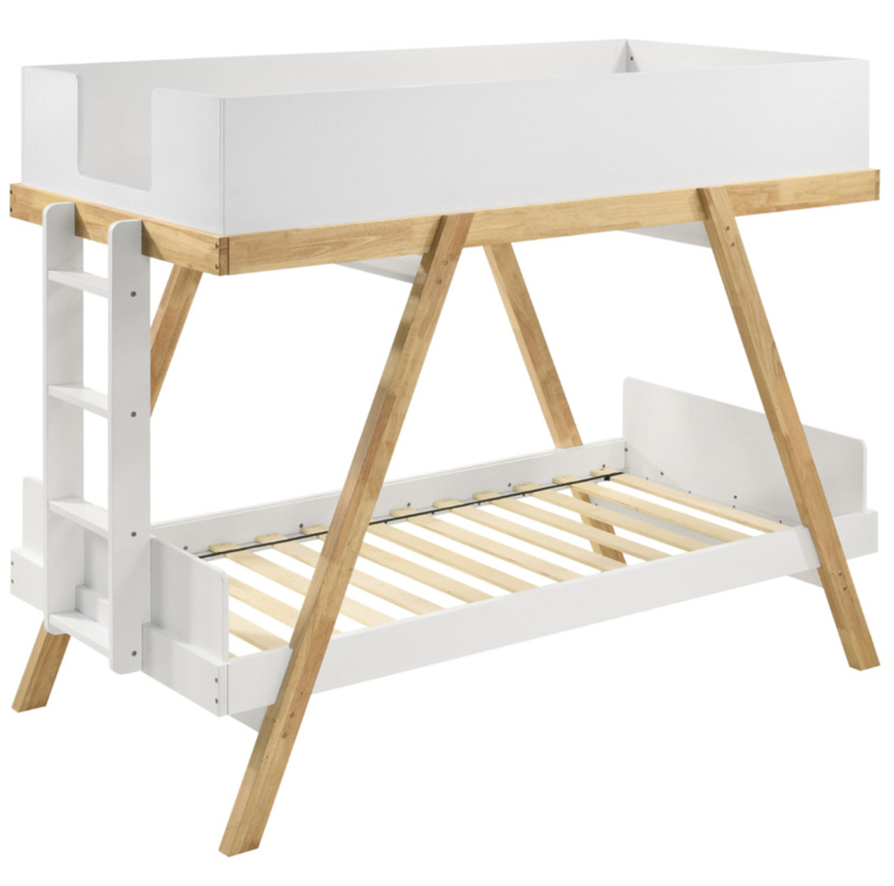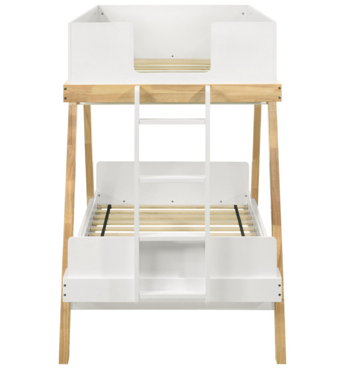 Refresh a bedroom with the farmhouse charm of a modern bunk bed with a twin-over-twin configuration. It takes design inspirations from a classic trestle, complete with angled supports and a two-tone finish that highlights its character. The upper bunk is surrounded on three sides with solid panels, adding safety. Its attached ladder provides access through the footboard. The lower bunk is open, with low head and footboards that add a finished look and feel.