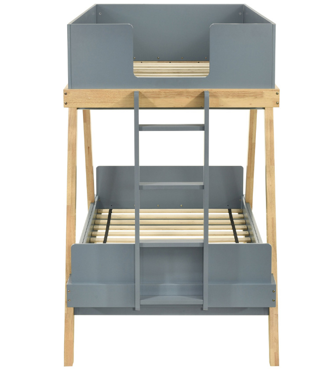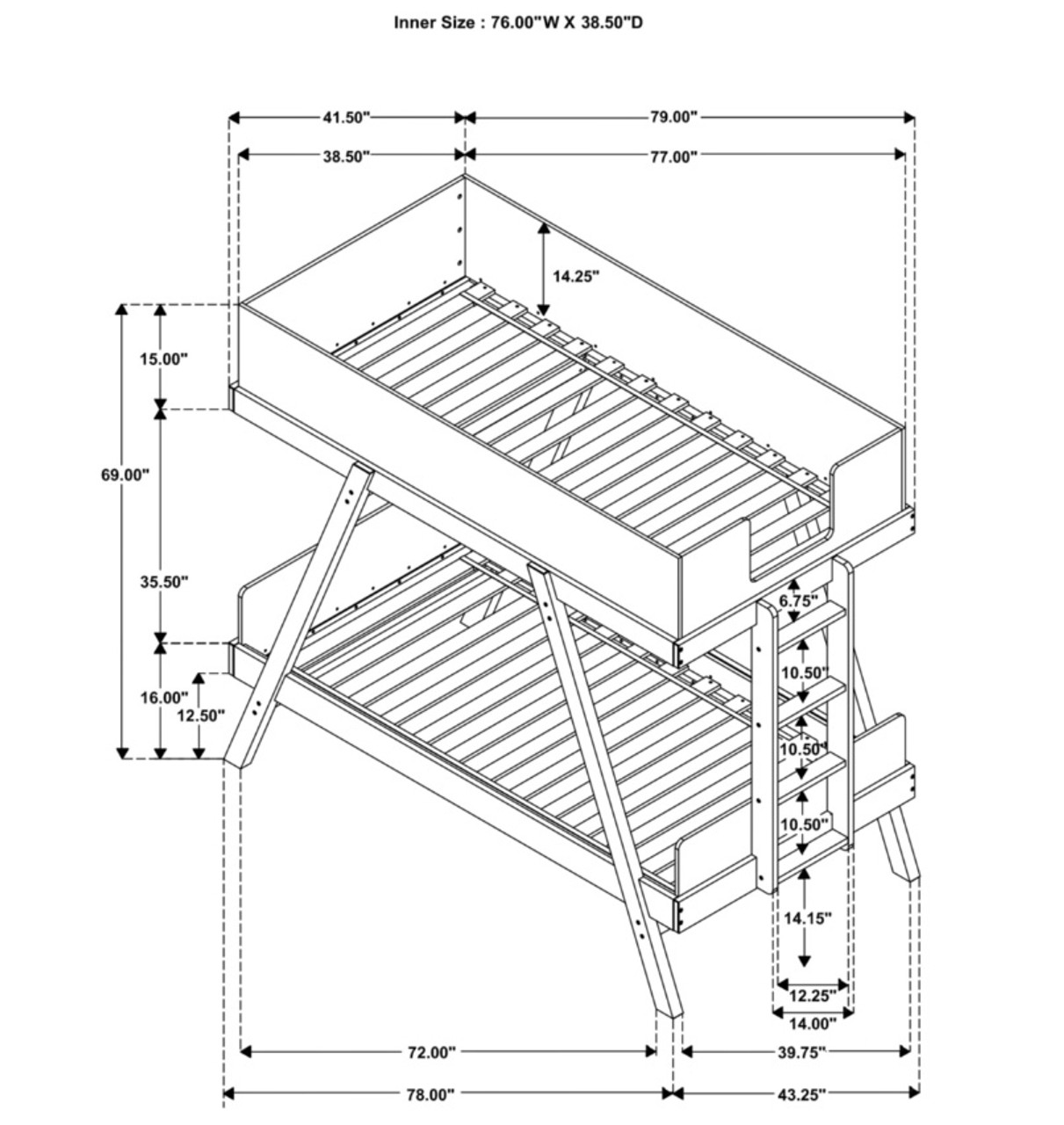 - Upper bunk features 3 side panels and opening for ladder